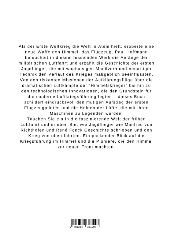 Als der Erste Weltkrieg die Welt in Atem hielt, eroberte eine neue Waffe den Himmel: das Flugzeug. Paul Hoffmann beleuchtet in diesem fesselnden Werk die Anfänge der militärischen Luftfahrt und erzählt die Geschichte der ersten Jagdflieger, die mit waghalsigen Manövern und neuartiger Technik den Verlauf des Krieges maßgeblich beeinflussten.Von den riskanten Missionen der Aufklärungsflüge über die dramatischen Luftkämpfe der "Himmelskrieger" bis hin zu den technologischen Innovationen, die den Grundstein für die moderne Luftkriegsführung legten - dieses Buch schildert eindrucksvoll den mutigen Aufstieg der ersten Flugzeugpiloten und die Helden der Lüfte, die mit ihren Maschinen zu Legenden wurden.Tauchen Sie ein in die faszinierende Welt der frühen Luftfahrt und erleben Sie, wie Jagdflieger wie Manfred von Richthofen und René Fonck Geschichte schrieben und den Krieg von oben führten. Ein packender Blick auf die Kriegsführung im Himmel und die Pioniere, die den Himmel zur neuen Front machten.