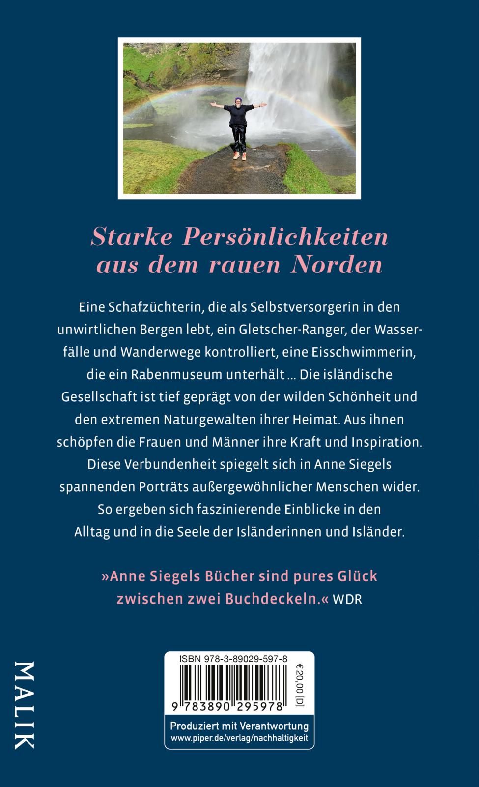 Eine Schafzüchterin, die als Selbstversorgerin in den unwirtlichen Bergen lebt, ein Gletscher-Ranger, der Wasserfälle und Wanderwege kontrolliert, eine Eisschwimmerin, die ein Rabenmuseum unterhält ... Die isländische Gesellschaft ist tief geprägt von der wilden Schönheit und den extremen Naturgewalten ihrer Heimat. Aus ihnen schöpfen die Männer und Frauen ihre Kraft und Inspiration. Diese Verbundenheit spiegelt sich in Anne Siegels spannenden Porträts außergewöhnlicher Menschen wider. So ergeben sich faszinierende Einblicke in den Alltag und in die Seele der Isländerinnen und Isländer.
