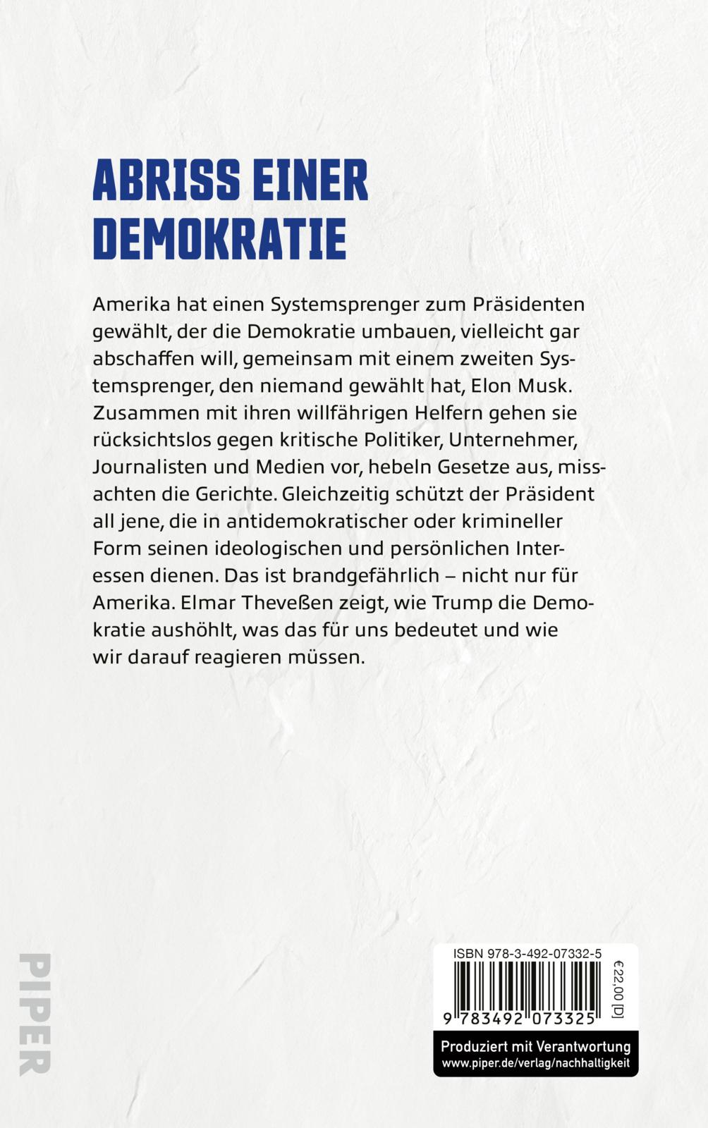 Die alte Weltordnung zerbröselt, befeuert durch den US-Präsidenten Donald Trump. Er zettelt Handelskriege an, untergräbt multilaterale Bündnisse und hebelt die Schutzmechanismen der amerikanischen Demokratie aus. Mit einer Säuberungswelle ungekannten Ausmaßes entfernt Trump alle Kritiker aus dem öffentlichen Dienst. Billionen von Dollar, die das Parlament für konkrete Projekte genehmigt hat, sind rechtswidrig beschlagnahmt. Ein nicht gewählter Milliardär bekommt Macht über die gesamte amerikanische Regierung. Wichtige Bürgerrechte und der Schutz von Minderheiten werden geschleift. Elmar Theveßen entwirft in diesem Buch das düstere Szenario vom Abgleiten in einen Autoritarismus, der uns alle bedroht. Deshalb brauchen wir endlich eine Vision und eine Strategie, um die Zukunft unseres Landes und unseres Kontinents zu gestalten; und wir brauchen ein entschlossenes und geschlossenes Europa, das die Stärken der liberalen Demokratie ausspielt gegen die Allmachtsfantasien von autoritären Anführern.