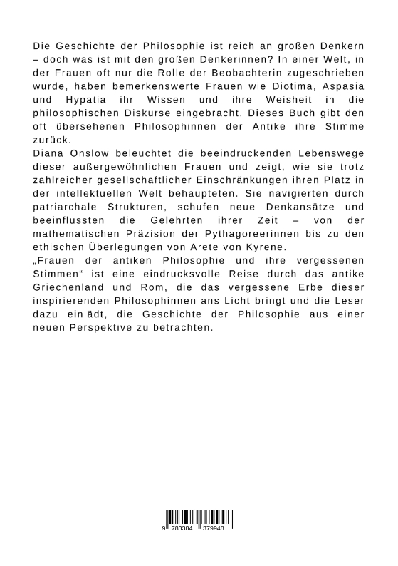 Die Geschichte der Philosophie ist reich an großen Denkern - doch was ist mit den großen Denkerinnen? In einer Welt, in der Frauen oft nur die Rolle der Beobachterin zugeschrieben wurde, haben bemerkenswerte Frauen wie Diotima, Aspasia und Hypatia ihr Wissen und ihre Weisheit in die philosophischen Diskurse eingebracht. Dieses Buch gibt den oft übersehenen Philosophinnen der Antike ihre Stimme zurück.Diana Onslow beleuchtet die beeindruckenden Lebenswege dieser außergewöhnlichen Frauen und zeigt, wie sie trotz zahlreicher gesellschaftlicher Einschränkungen ihren Platz in der intellektuellen Welt behaupteten. Sie navigierten durch patriarchale Strukturen, schufen neue Denkansätze und beeinflussten die Gelehrten ihrer Zeit - von der mathematischen Präzision der Pythagoreerinnen bis zu den ethischen Überlegungen von Arete von Kyrene."Frauen der antiken Philosophie und ihre vergessenen Stimmen" ist eine eindrucksvolle Reise durch das antike Griechenland und Rom, die das vergessene Erbe dieser inspirierenden Philosophinnen ans Licht bringt und die Leser dazu einlädt, die Geschichte der Philosophie aus einer neuen Perspektive zu betrachten.