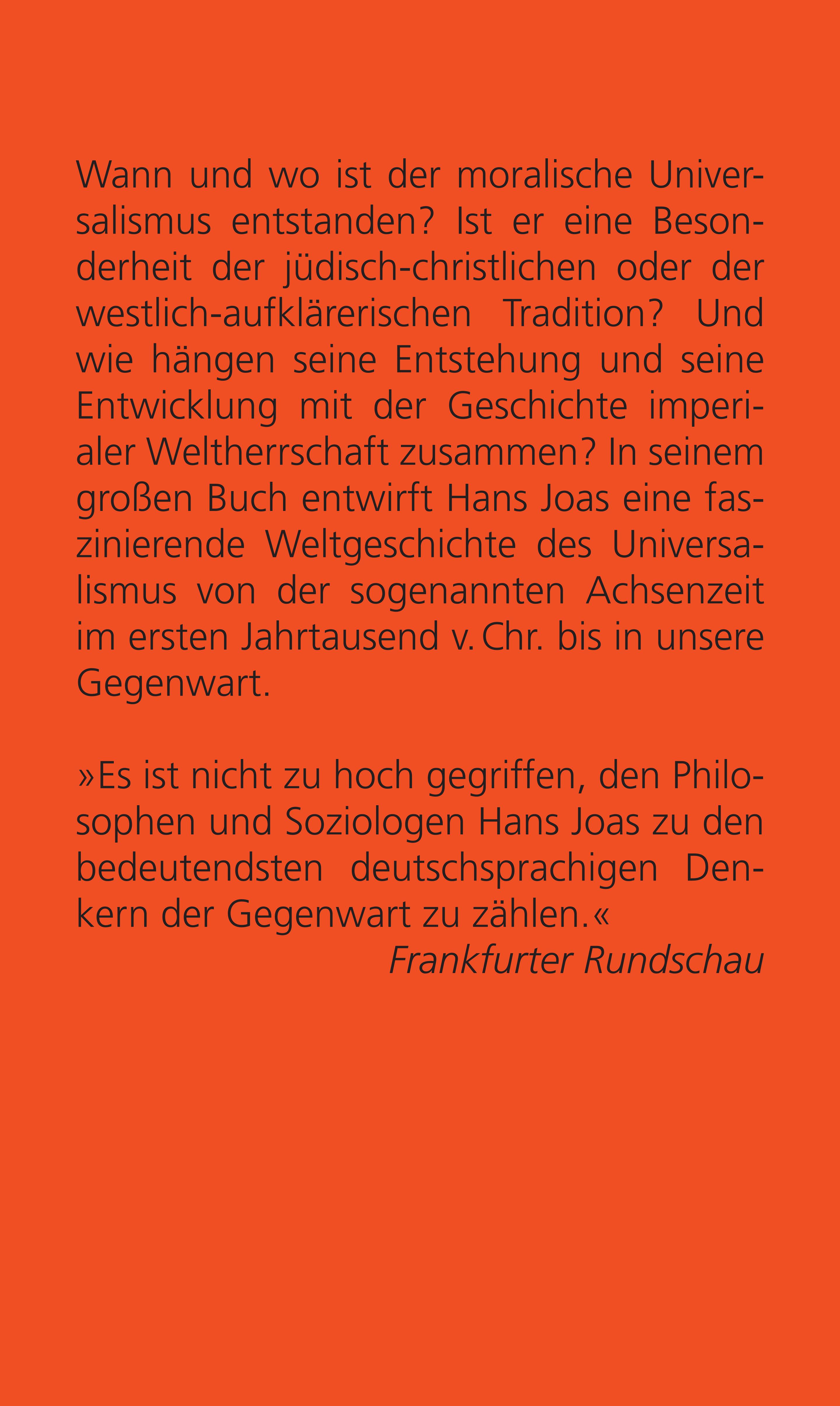 Von der sogenannten »Achsenzeit« ausgehend, zeichnet er dessen Entstehung in der griechischen Antike, in Judentum und Christentum, in Indien und China nach und betrachtet es im Zusammenhang mit imperialen Reichsbildungen bis hin zum Kolonialismus, Faschismus und Kommunismus. Kann es einen Universalismus ohne Imperialismus überhaupt geben? Und wie steht der Islam zu den achsenzeitlichen Entwürfen eines Menschheitsethos? Joas' Antworten auf diese großen Fragen fügen sich zu einem Opus Magnum, mit dem er seine vielbeachteten Arbeiten zur Geschichte von Religion und politischer Macht krönt.