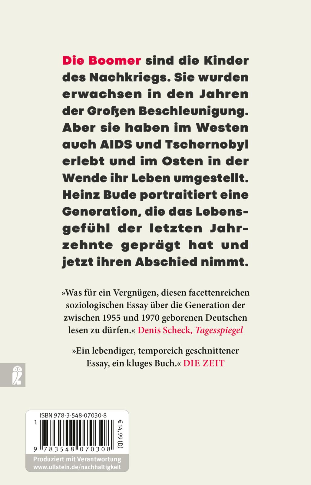 Die Boomer sind die Kinder des Nachkriegs. Sie wurden erwachsen in den Jahren der Großen Beschleunigung. Aber sie haben im Westen auch AIDS und Tschernobyl erlebt und im Osten in der Wende ihr Leben umgestellt. Heinz Bude portraitiert eine Generation, die das Lebensgefühl der letzten Jahrzehnte geprägt hat und jetzt ihren Abschied nimmt.