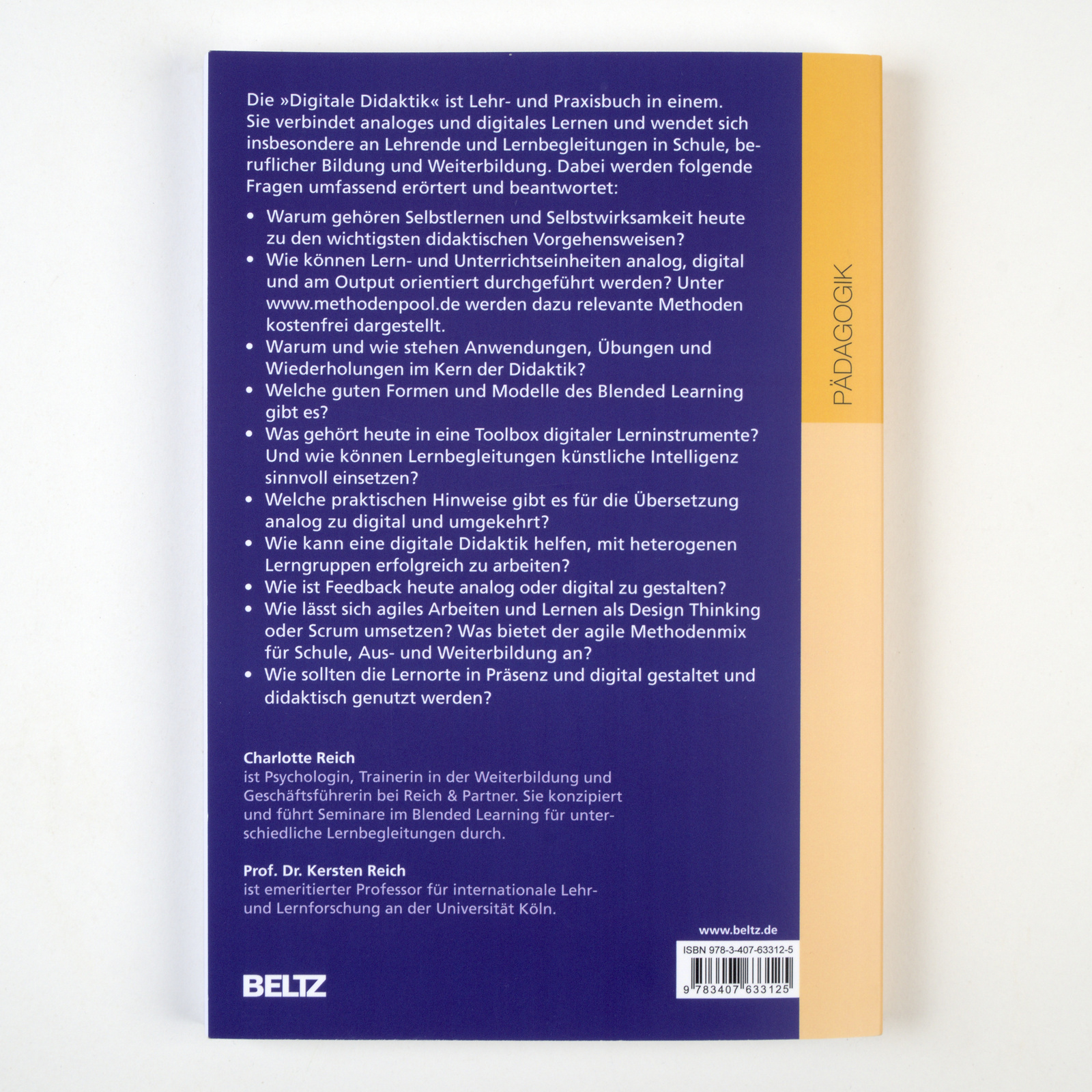 Digitale Didaktik begründet, worauf im digitalen Lernen und Blended Learning zu achten ist. In diesem Buch geben Charlotte und Kersten Reich einen Überblick über zehn zentrale Aspekte, die das moderne Lernen in Präsenz und Online heute ausmachen, unter anderem Selbstlernen und Selbstwirksamkeit, Blended-Learning-Modelle in der Umsetzung, handlungsorientiertes Lernen mit heterogenen Lerngruppen, agiles und mobiles Lernen (Design Thinking, Scrum), künstliche Intelligenz, analoge und digitale Lernorte, insbesondere auch Lerncluster und -landschaften, sowie gezieltes und effektives Feedback.