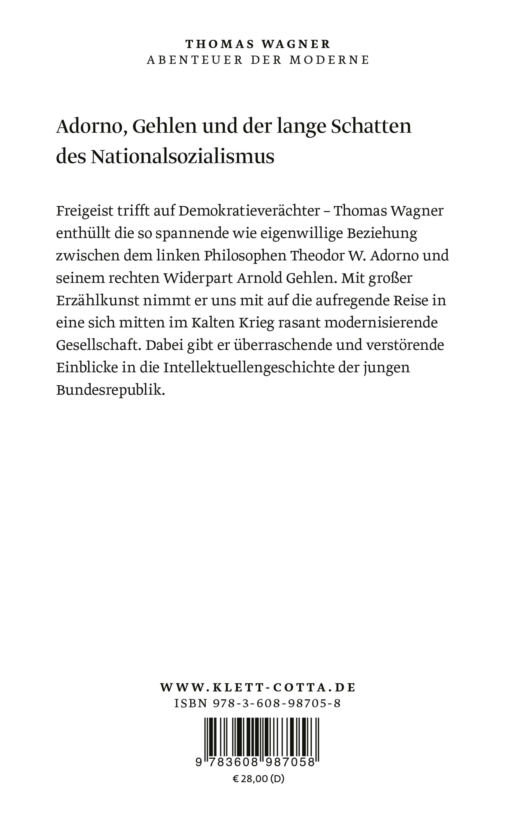 Frühjahr 1958: Theodor W. Adorno bezichtigt seinen Kollegen Arnold Gehlen mit einem vernichtenden Gutachten des faschistischen Denkens – und verhindert dessen Berufung nach Heidelberg. Wenige Jahre später schreiben sie sich Briefe, treffen sich privat und führen eine Reihe von Rundfunkgesprächen – wieso? Vor dem Hintergrund von Wiederbewaffnung und deutscher Teilung schildert Thomas Wagner die Geschichte dieser außergewöhnlichen Begegnung. Er zeigt, wie sich die Soziologie als neue Leitwissenschaft etabliert und welchen Anteil ehemalige Nationalsozialisten dabei haben. Sein Erzählbogen reicht von der Weimarer Republik über den Nationalsozialismus bis in die Hauptstadt der DDR. Mit illustren Figuren wie Arendt, Benn, Brecht, Augstein, Plessner und Harich entsteht ein plastisches Bild von der intellektuellen Gründung der Bundesrepublik. Die Wurzeln der aufgeheizten Debatten unserer Gegenwart erscheinen dadurch in einem überraschend neuen Licht.