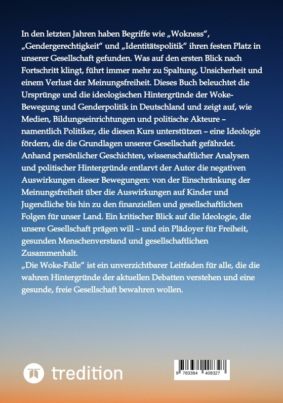 In den letzten Jahren haben Begriffe wie "Wokness", "Gendergerechtigkeit" und "Identitätspolitik" ihren festen Platz in unserer Gesellschaft gefunden. Was auf den ersten Blick nach Fortschritt klingt, führt immer mehr zu Spaltung, Unsicherheit und einem Verlust der Meinungsfreiheit. Dieses Buch beleuchtet die Ursprünge und die ideologischen Hintergründe der Woke-Bewegung und Genderpolitik in Deutschland und zeigt auf, wie Medien, Bildungseinrichtungen und politische Akteure - namentlich Politiker, die diesen Kurs unterstützen - eine Ideologie fördern, die die Grundlagen unserer Gesellschaft gefährdet.Anhand persönlicher Geschichten, wissenschaftlicher Analysen und politischer Hintergründe entlarvt der Autor die negativen Auswirkungen dieser Bewegungen: von der Einschränkung der Meinungsfreiheit über die Auswirkungen auf Kinder und Jugendliche bis hin zu den finanziellen und gesellschaftlichen Folgen für unser Land. Ein kritischer Blick auf die Ideologie, die unsere Gesellschaft prägen will - und ein Plädoyer für Freiheit, gesunden Menschenverstand und gesellschaftlichen Zusammenhalt."Die Woke-Falle" ist ein unverzichtbarer Leitfaden für alle, die die wahren Hintergründe der aktuellen Debatten verstehen und eine gesunde, freie Gesellschaft bewahren wollen.