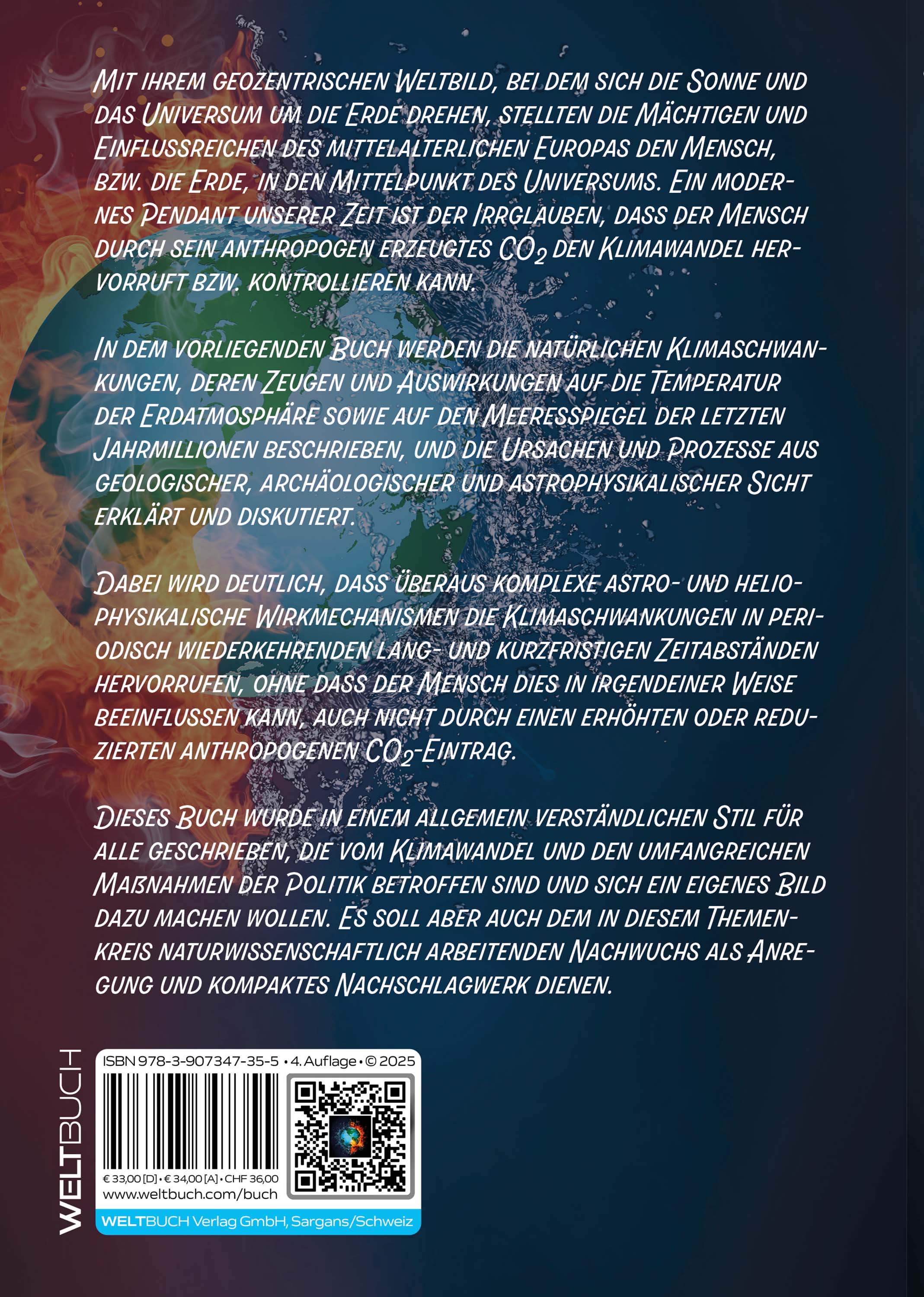 Mit ihrem geozentrischen Weltbild, bei dem sich die Sonne und das Universum um die Erde drehen, stellten die Mächtigen und Einflussreichen des mittelalterlichen Europas den Mensch, bzw. die Erde, in den Mittelpunkt des Universums. Ein modernes Pendant unserer Zeit ist der Irrglauben, dass der Mensch durch sein anthropogen erzeugtes CO2 den Klimawandel hervorruft bzw. kontrollieren kann.In dem vorliegenden Buch werden die natürlichen Klimaschwankungen, deren Zeugen und Auswirkungen auf die Temperatur der Erdatmosphäre sowie auf den Meeresspiegel der letzten Jahrmillionen beschrieben, und die Ursachen und Prozesse aus geologischer, archäologischer und astrophysikalischer Sicht erklärt und diskutiert.Dabei wird deutlich, dass überaus komplexe astro- und heliophysikalische Wirkmechanismen die Klimaschwankungen in periodisch wiederkehrenden lang- und kurzfristigen Zeitabständen hervorrufen, ohne dass der Mensch dies in irgendeiner Weise beeinflussen kann, auch nicht durch einen erhöhten oder reduzierten anthropogenen CO2-Eintrag.Dieses Buch wurde in einem allgemein verständlichen Stil für alle geschrieben, die vom Klimawandel und den umfangreichen Maßnahmen der Politik betroffen sind und sich ein eigenes Bild dazu machen wollen. Es soll aber auch dem in diesem Themenkreis naturwissenschaftlich arbeitenden Nachwuchs als Anregung und kompaktes Nachschlagwerk dienen.