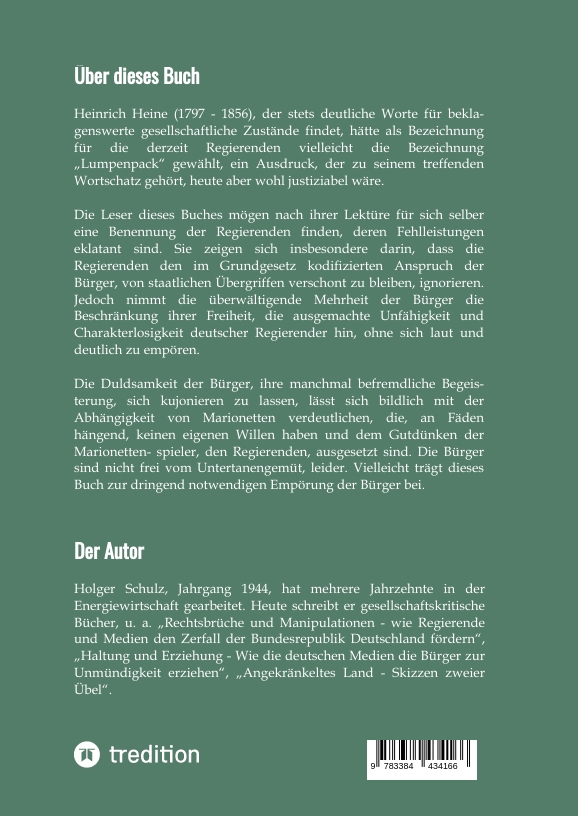 Der Autor Holger Schulz, Jahrgang 1944, hat mehrere Jahrzehnte in der Energiewirtschaft gearbeitet. Heute schreibt er gesellschaftskritische Bücher, u.a. „Rechtsbrüche und Manipulationen - Wie Regierende und Medien den Zerfall der Bundesrepublik Deutschland fördern“, „Haltung und Erziehung - Wie die deutschen Medien die Bürger zur Unmündigkeit erziehen“, "Angekränkeltes Land - Skizzen zweier Übel".