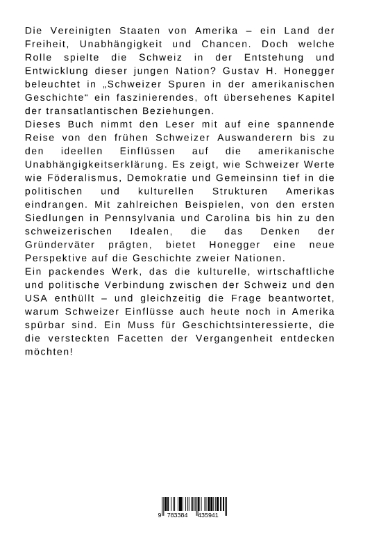Die Vereinigten Staaten von Amerika - ein Land der Freiheit, Unabhängigkeit und Chancen. Doch welche Rolle spielte die Schweiz in der Entstehung und Entwicklung dieser jungen Nation? Gustav H. Honegger beleuchtet in "Schweizer Spuren in der amerikanischen Geschichte" ein faszinierendes, oft übersehenes Kapitel der transatlantischen Beziehungen.Dieses Buch nimmt den Leser mit auf eine spannende Reise von den frühen Schweizer Auswanderern bis zu den ideellen Einflüssen auf die amerikanische Unabhängigkeitserklärung. Es zeigt, wie Schweizer Werte wie Föderalismus, Demokratie und Gemeinsinn tief in die politischen und kulturellen Strukturen Amerikas eindrangen. Mit zahlreichen Beispielen, von den ersten Siedlungen in Pennsylvania und Carolina bis hin zu den schweizerischen Idealen, die das Denken der Gründerväter prägten, bietet Honegger eine neue Perspektive auf die Geschichte zweier Nationen.Ein packendes Werk, das die kulturelle, wirtschaftliche und politische Verbindung zwischen der Schweiz und den USA enthüllt - und gleichzeitig die Frage beantwortet, warum Schweizer Einflüsse auch heute noch in Amerika spürbar sind. Ein Muss für Geschichtsinteressierte, die die versteckten Facetten der Vergangenheit entdecken möchten!