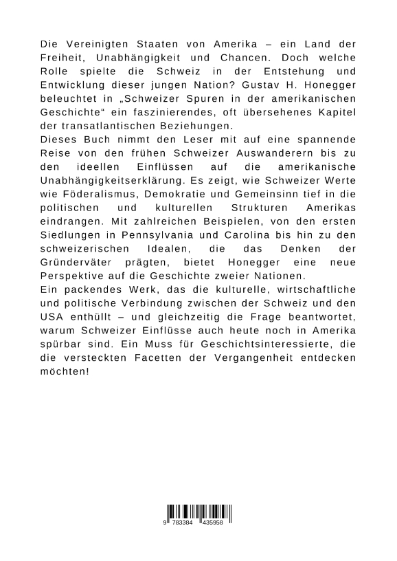 Die Vereinigten Staaten von Amerika - ein Land der Freiheit, Unabhängigkeit und Chancen. Doch welche Rolle spielte die Schweiz in der Entstehung und Entwicklung dieser jungen Nation? Gustav H. Honegger beleuchtet in "Schweizer Spuren in der amerikanischen Geschichte" ein faszinierendes, oft übersehenes Kapitel der transatlantischen Beziehungen.Dieses Buch nimmt den Leser mit auf eine spannende Reise von den frühen Schweizer Auswanderern bis zu den ideellen Einflüssen auf die amerikanische Unabhängigkeitserklärung. Es zeigt, wie Schweizer Werte wie Föderalismus, Demokratie und Gemeinsinn tief in die politischen und kulturellen Strukturen Amerikas eindrangen. Mit zahlreichen Beispielen, von den ersten Siedlungen in Pennsylvania und Carolina bis hin zu den schweizerischen Idealen, die das Denken der Gründerväter prägten, bietet Honegger eine neue Perspektive auf die Geschichte zweier Nationen.Ein packendes Werk, das die kulturelle, wirtschaftliche und politische Verbindung zwischen der Schweiz und den USA enthüllt - und gleichzeitig die Frage beantwortet, warum Schweizer Einflüsse auch heute noch in Amerika spürbar sind. Ein Muss für Geschichtsinteressierte, die die versteckten Facetten der Vergangenheit entdecken möchten!