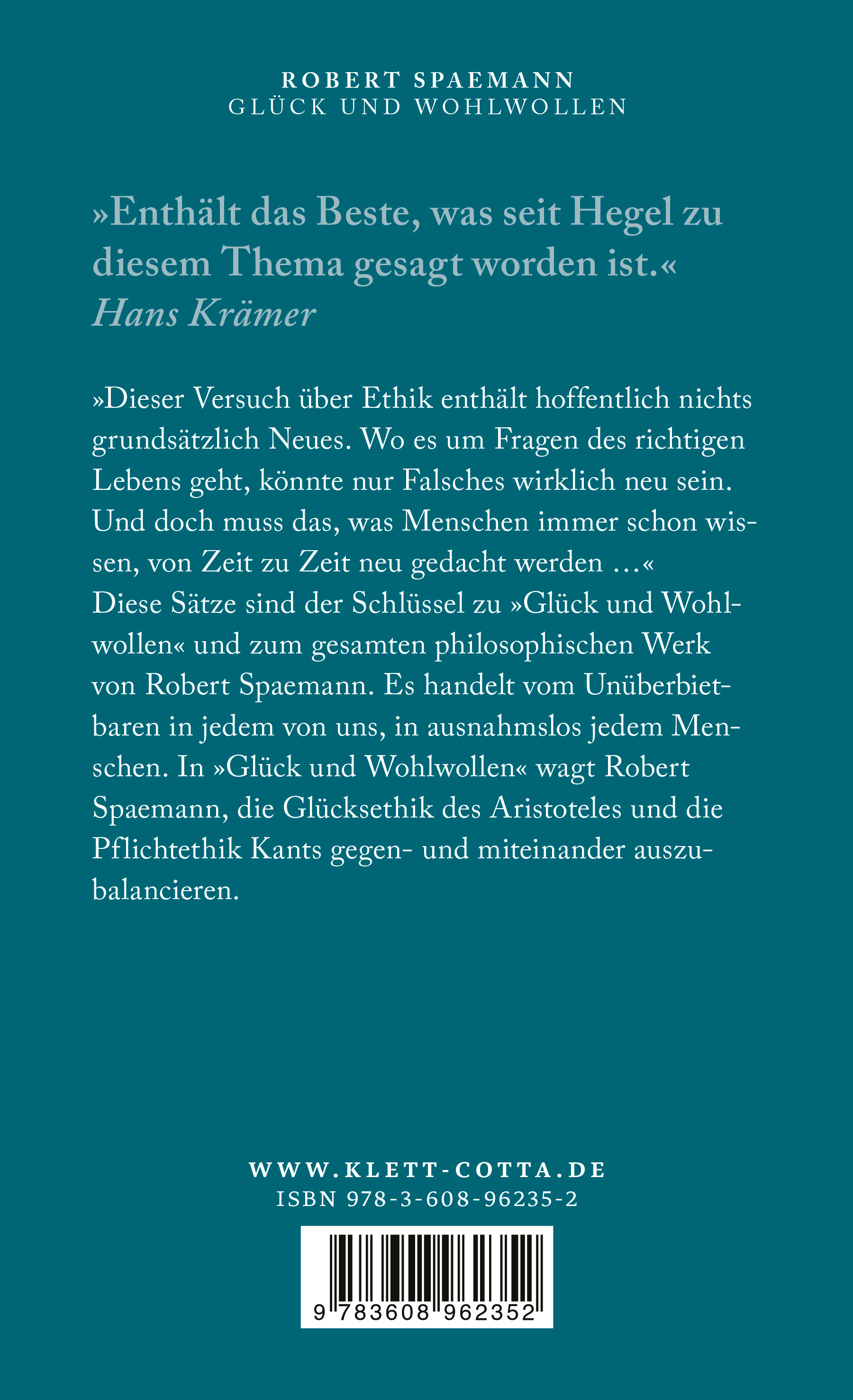 Robert Spaemann legt mit »Glück und Wohlwollen« einen eigenen, teleologischen Versuch über Ethik vor, der höchste Beachtung gefunden hat. Diese ersten Sätze des Buches sind der Schlüssel zu »Glück und Wohlwollen« und zum gesamten philosophischen Werk von Robert Spaemann. Es handelt vom Unüberbietbaren in jedem von uns, in ausnahmslos jedem Menschen. In diesem Buch wagt Robert Spaemann, die Glücksethik des Aristoteles und die Pflichtethik Kants gegen- und miteinander auszubalancieren.