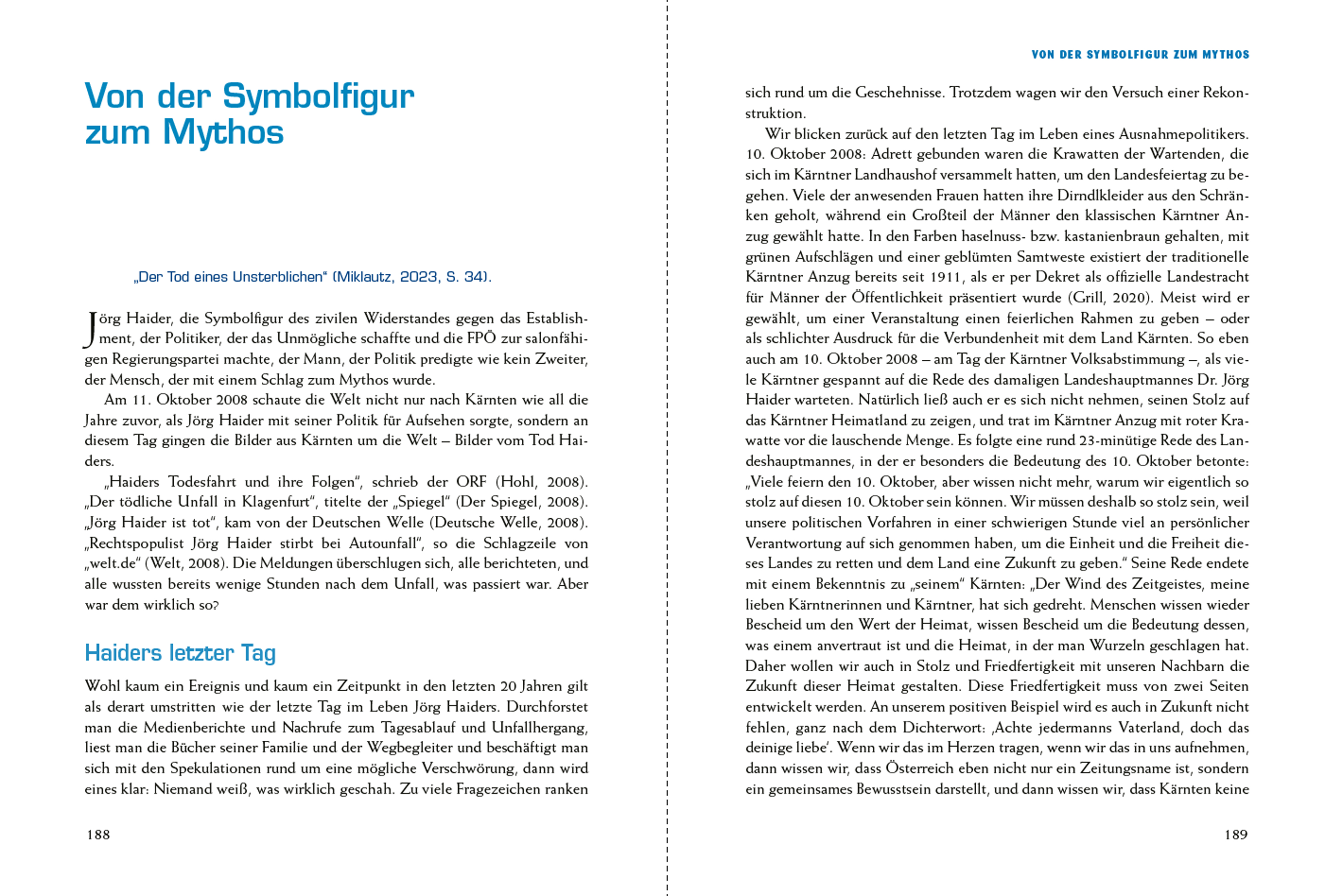 Anhand von Originaldokumenten und Gesprächen mit Witwe Claudia, engen Freunden, Mitarbeitern und politischen Weggefährten folgt dieses Buch dem Weg eines facettenreichen Mannes, der weit über Österreich hinaus Bekanntheit erlangte. Es beleuchtet den Privatmenschen Jörg Haider mit seinen vielfältigen Interessen ebenso wie den Vollblutpolitiker von seinen ersten Schritten in der FPÖ über Wendepunkte wie Knittelfeld oder die Abspaltung des BZÖ bis zu seinem Tod 2008. Dieses Werk ist unverzichtbar für alle, die dem „Mythos Haider“ näher kommen wollen.