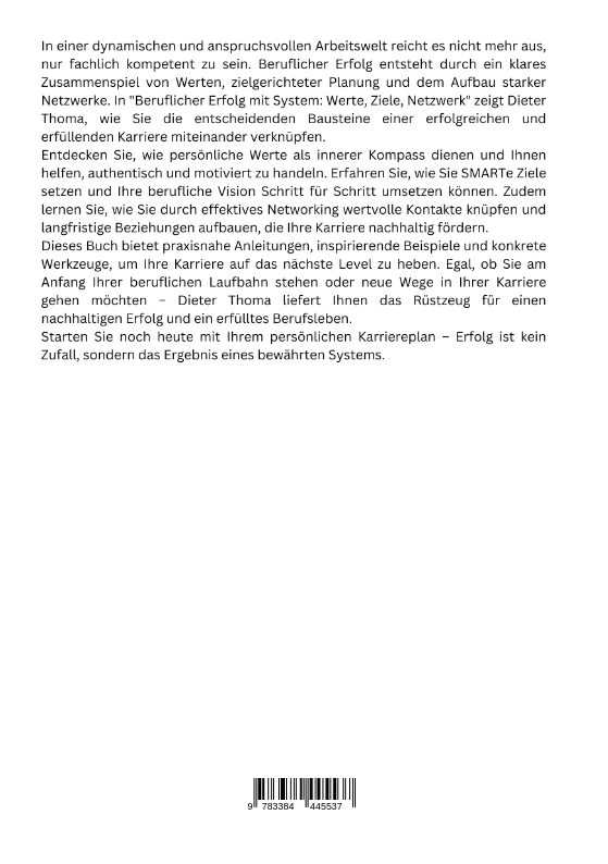 In einer dynamischen und anspruchsvollen Arbeitswelt reicht es nicht mehr aus, nur fachlich kompetent zu sein. Beruflicher Erfolg entsteht durch ein klares Zusammenspiel von Werten, zielgerichteter Planung und dem Aufbau starker Netzwerke. In "Beruflicher Erfolg mit System: Werte, Ziele, Netzwerk" zeigt Dieter Thoma, wie Sie die entscheidenden Bausteine einer erfolgreichen und erfüllenden Karriere miteinander verknüpfen.Entdecken Sie, wie persönliche Werte als innerer Kompass dienen und Ihnen helfen, authentisch und motiviert zu handeln. Erfahren Sie, wie Sie SMARTe Ziele setzen und Ihre berufliche Vision Schritt für Schritt umsetzen können. Zudem lernen Sie, wie Sie durch effektives Networking wertvolle Kontakte knüpfen und langfristige Beziehungen aufbauen, die Ihre Karriere nachhaltig fördern.Dieses Buch bietet praxisnahe Anleitungen, inspirierende Beispiele und konkrete Werkzeuge, um Ihre Karriere auf das nächste Level zu heben. Egal, ob Sie am Anfang Ihrer beruflichen Laufbahn stehen oder neue Wege in Ihrer Karriere gehen möchten - Dieter Thoma liefert Ihnen das Rüstzeug für einen nachhaltigen Erfolg und ein erfülltes Berufsleben.Starten Sie noch heute mit Ihrem persönlichen Karriereplan - Erfolg ist kein Zufall, sondern das Ergebnis eines bewährten Systems.