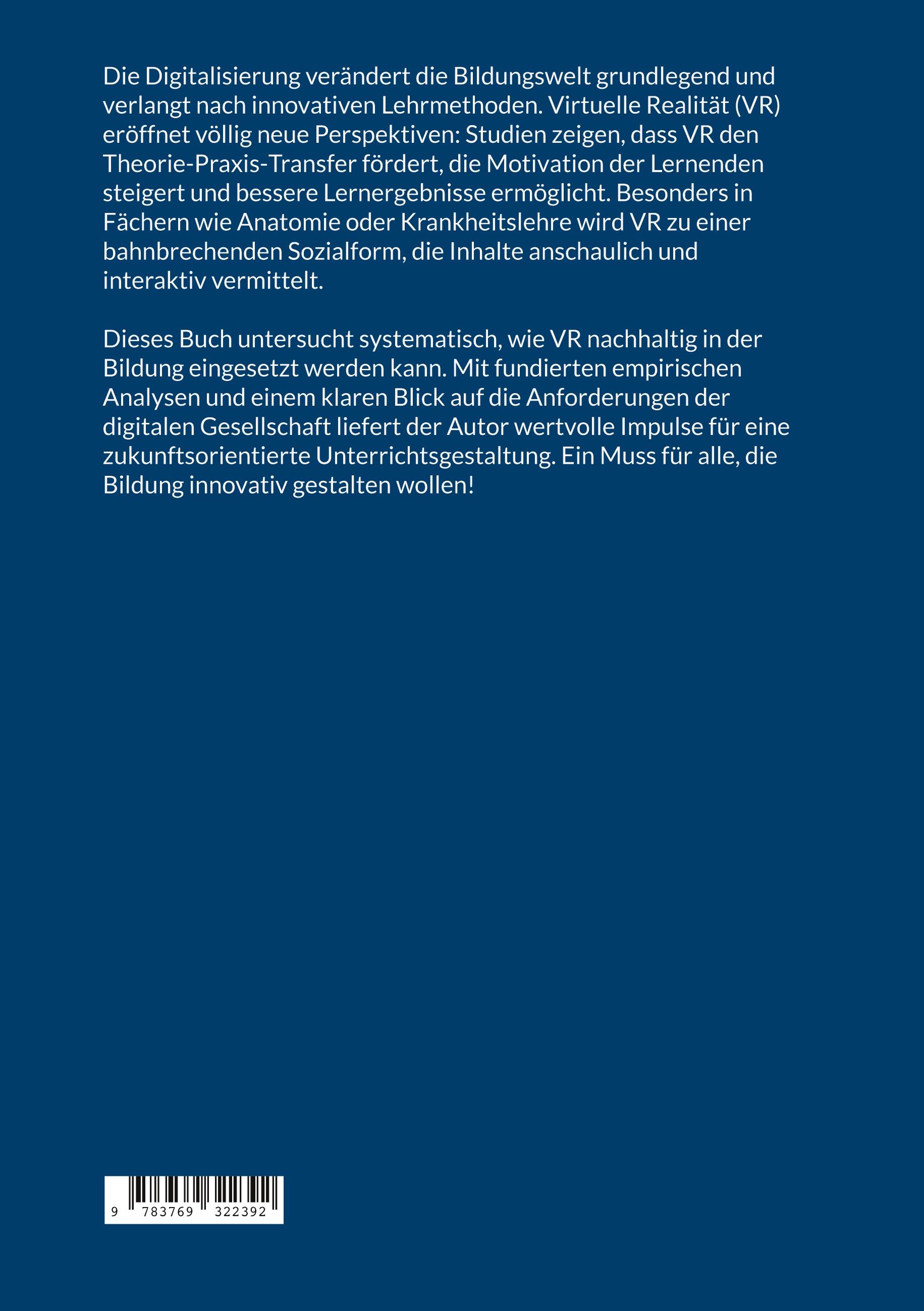 Dieses Buch untersucht systematisch, wie VR nachhaltig in der Bildung eingesetzt werden kann. Mit fundierten empirischen Analysen und einem klaren Blick auf die Anforderungen der digitalen Gesellschaft liefert der Autor wertvolle Impulse für eine zukunftsorientierte Unterrichtsgestaltung. Ein Muss für alle, die Bildung innovativ gestalten wollen!