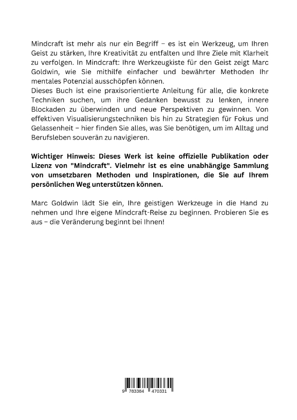 Mindcraft ist mehr als nur ein Begriff - es ist ein Werkzeug, um Ihren Geist zu stärken, Ihre Kreativität zu entfalten und Ihre Ziele mit Klarheit zu verfolgen. In Mindcraft: Ihre Werkzeugkiste für den Geist zeigt Marc Goldwin, wie Sie mithilfe einfacher und bewährter Methoden Ihr mentales Potenzial ausschöpfen können.Dieses Buch ist eine praxisorientierte Anleitung für alle, die konkrete Techniken suchen, um ihre Gedanken bewusst zu lenken, innere Blockaden zu überwinden und neue Perspektiven zu gewinnen. Von effektiven Visualisierungstechniken bis hin zu Strategien für Fokus und Gelassenheit - hier finden Sie alles, was Sie benötigen, um im Alltag und Berufsleben souverän zu navigieren.Wichtiger Hinweis: Dieses Werk ist keine offizielle Publikation oder Lizenz von "Mindcraft". Vielmehr ist es eine unabhängige Sammlung von umsetzbaren Methoden und Inspirationen, die Sie auf Ihrem persönlichen Weg unterstützen können.Marc Goldwin lädt Sie ein, Ihre geistigen Werkzeuge in die Hand zu nehmen und Ihre eigene Mindcraft-Reise zu beginnen. Probieren Sie es aus - die Veränderung beginnt bei Ihnen!