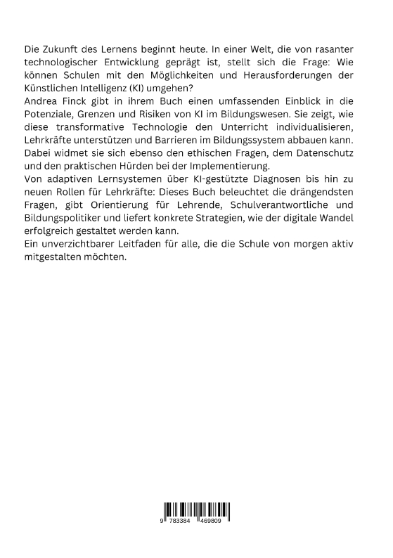 Die Zukunft des Lernens beginnt heute. In einer Welt, die von rasanter technologischer Entwicklung geprägt ist, stellt sich die Frage: Wie können Schulen mit den Möglichkeiten und Herausforderungen der Künstlichen Intelligenz (KI) umgehen?Andrea Finck gibt in ihrem Buch einen umfassenden Einblick in die Potenziale, Grenzen und Risiken von KI im Bildungswesen. Sie zeigt, wie diese transformative Technologie den Unterricht individualisieren, Lehrkräfte unterstützen und Barrieren im Bildungssystem abbauen kann. Dabei widmet sie sich ebenso den ethischen Fragen, dem Datenschutz und den praktischen Hürden bei der Implementierung.Von adaptiven Lernsystemen über KI-gestützte Diagnosen bis hin zu neuen Rollen für Lehrkräfte: Dieses Buch beleuchtet die drängendsten Fragen, gibt Orientierung für Lehrende, Schulverantwortliche und Bildungspolitiker und liefert konkrete Strategien, wie der digitale Wandel erfolgreich gestaltet werden kann.Ein unverzichtbarer Leitfaden für alle, die die Schule von morgen aktiv mitgestalten möchten.