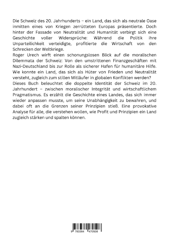 Die Schweiz des 20. Jahrhunderts - ein Land, das sich als neutrale Oase inmitten eines von Kriegen zerrütteten Europas präsentierte. Doch hinter der Fassade von Neutralität und Humanität verbirgt sich eine Geschichte voller Widersprüche: Während die Politik ihre Unparteilichkeit verteidigte, profitierte die Wirtschaft von den Schrecken der Weltkriege.Roger Urech wirft einen schonungslosen Blick auf die moralischen Dilemmata der Schweiz: Von den umstrittenen Finanzgeschäften mit Nazi-Deutschland bis zur Rolle als sicherer Hafen für humanitäre Hilfe. Wie konnte ein Land, das sich als Hüter von Frieden und Neutralität versteht, zugleich zum stillen Mitläufer in globalen Konflikten werden?Dieses Buch beleuchtet die doppelte Identität der Schweiz im 20. Jahrhundert - zwischen moralischer Integrität und wirtschaftlichem Pragmatismus. Es erzählt die Geschichte eines Landes, das sich immer wieder anpassen musste, um seine Unabhängigkeit zu bewahren, und dabei oft an die Grenzen seiner Prinzipien stieß. Eine provokative Analyse für alle, die verstehen wollen, wie Profit und Prinzipien ein Land zugleich stärken und spalten können.Falls Sie weitere Akzente oder Schwerpunkte wünschen, passe ich den Text gerne an!