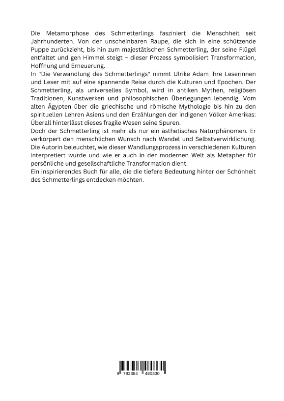 Die Metamorphose des Schmetterlings fasziniert die Menschheit seit Jahrhunderten. Von der unscheinbaren Raupe, die sich in eine schützende Puppe zurückzieht, bis hin zum majestätischen Schmetterling, der seine Flügel entfaltet und gen Himmel steigt - dieser Prozess symbolisiert Transformation, Hoffnung und Erneuerung.In "Die Verwandlung des Schmetterlings" nimmt Ulrike Adam ihre Leserinnen und Leser mit auf eine spannende Reise durch die Kulturen und Epochen. Der Schmetterling, als universelles Symbol, wird in antiken Mythen, religiösen Traditionen, Kunstwerken und philosophischen Überlegungen lebendig. Vom alten Ägypten über die griechische und römische Mythologie bis hin zu den spirituellen Lehren Asiens und den Erzählungen der indigenen Völker Amerikas: Überall hinterlässt dieses fragile Wesen seine Spuren.Doch der Schmetterling ist mehr als nur ein ästhetisches Naturphänomen. Er verkörpert den menschlichen Wunsch nach Wandel und Selbstverwirklichung. Die Autorin beleuchtet, wie dieser Wandlungsprozess in verschiedenen Kulturen interpretiert wurde und wie er auch in der modernen Welt als Metapher für persönliche und gesellschaftliche Transformation dient.Ein inspirierendes Buch für alle, die die tiefere Bedeutung hinter der Schönheit des Schmetterlings entdecken möchten.