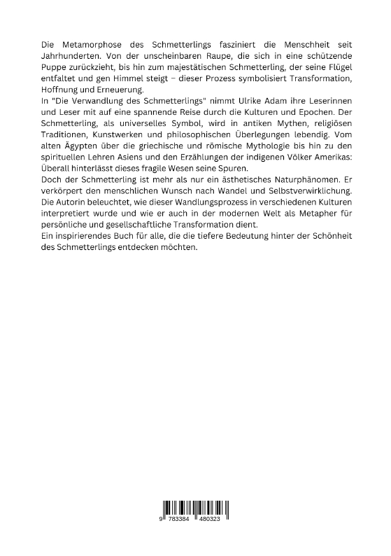 Die Metamorphose des Schmetterlings fasziniert die Menschheit seit Jahrhunderten. Von der unscheinbaren Raupe, die sich in eine schützende Puppe zurückzieht, bis hin zum majestätischen Schmetterling, der seine Flügel entfaltet und gen Himmel steigt - dieser Prozess symbolisiert Transformation, Hoffnung und Erneuerung.In "Die Verwandlung des Schmetterlings" nimmt Ulrike Adam ihre Leserinnen und Leser mit auf eine spannende Reise durch die Kulturen und Epochen. Der Schmetterling, als universelles Symbol, wird in antiken Mythen, religiösen Traditionen, Kunstwerken und philosophischen Überlegungen lebendig. Vom alten Ägypten über die griechische und römische Mythologie bis hin zu den spirituellen Lehren Asiens und den Erzählungen der indigenen Völker Amerikas: Überall hinterlässt dieses fragile Wesen seine Spuren.Doch der Schmetterling ist mehr als nur ein ästhetisches Naturphänomen. Er verkörpert den menschlichen Wunsch nach Wandel und Selbstverwirklichung. Die Autorin beleuchtet, wie dieser Wandlungsprozess in verschiedenen Kulturen interpretiert wurde und wie er auch in der modernen Welt als Metapher für persönliche und gesellschaftliche Transformation dient.Ein inspirierendes Buch für alle, die die tiefere Bedeutung hinter der Schönheit des Schmetterlings entdecken möchten.
