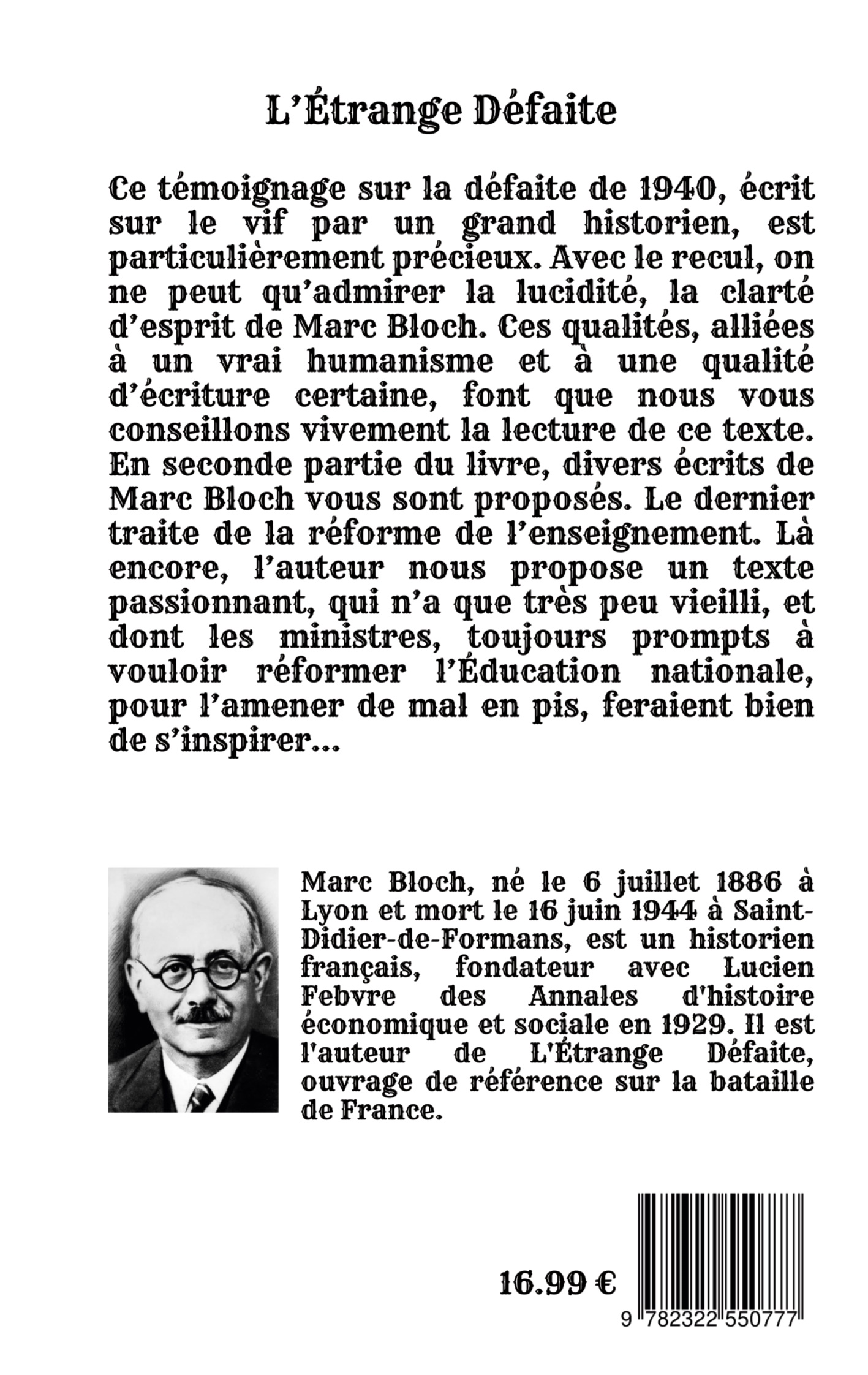 Ce témoignage sur la défaite de 1940, écrit sur le vif par un grand historien, est particulièrement précieux. Avec le recul, on ne peut qu'admirer la lucidité, la clarté d'esprit de Marc Bloch. Ces qualités alliées à un vrai humanisme et à une qualité d'écriture certaine, font que nous vous conseillons vivement la lecture de ce texte. En seconde partie du livre, divers écrits de Marc Bloch vous sont proposés. Le dernier traite de la réforme de l'enseignement, qui n'a que très peu vieilli, et dont les ministres, toujours prompts à vouloir réformer l'éducation nationale, pour l'amener de mal en pis, feraient bien de s'inspirer.