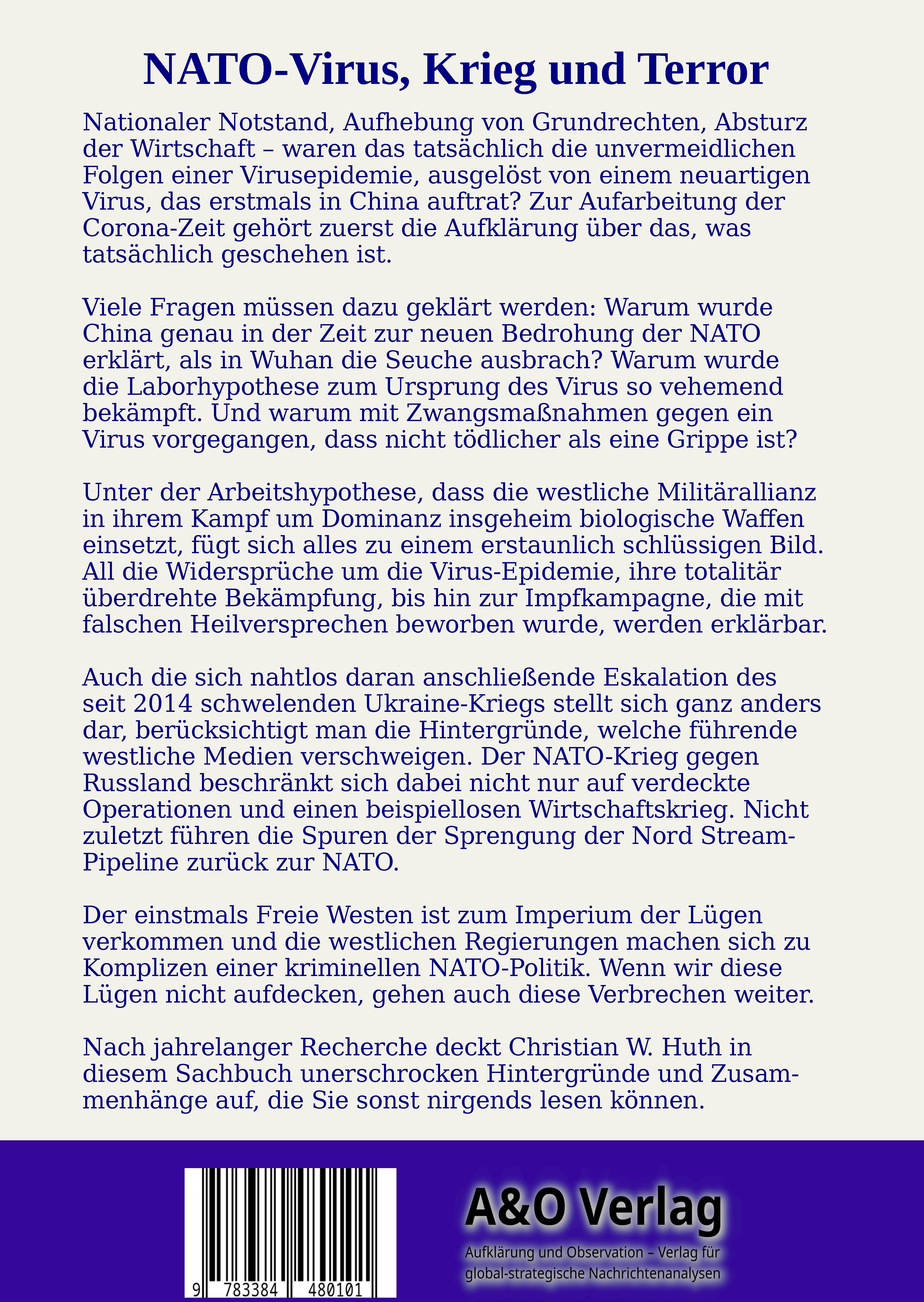 Nationaler Notstand, Aufhebung von Grundrechten, Absturz der Wirtschaft - waren das tatsächlich die unvermeidlichen Folgen einer Virusepidemie, ausgelöst von einem neuartigen Virus, das erstmals in China auftrat? Was wäre, wenn das Virus künstlich erschaffen wurde und als Laborunfall oder - schlimmer noch - mit Absicht als Biowaffe freigesetzt wurde? Und warum wurde mit Gewalt versucht, die Diskussion um die Laborhypothese zum Ursprung des Virus zu unterbinden? Genau dieser Umstand hat unseren Autor Christian W. Huth bereits früh alarmiert und die These eines gezielten Biowaffeneinsatzes in Betracht ziehen lassen. Viele weitere Fragen rund um Corona werden bis heute kontrovers diskutiert, und oft auch tabuisiert oder gar zensiert. Gibt es womöglich ein verbindendes Element, das sowohl die Hysterie um Corona mit ihren dramatischen Freiheitsbeschränkungen einerseits als auch die überstürzte und mit falschen Heilversprechen geführte Impfkampagne anderseits erklärt? Um diese Zeit wirksam aufarbeiten zu können, müssen wir zuerst aufklären, was wirklich geschehen ist. Unter der Arbeitshypothese, dass die westliche Militärallianz in ihrem Kampf um Dominanz tatsächlich insgeheim biologische Waffen entwickelt und einsetzt, fügen sich auch viele scheinbare Widersprüche zu einem erstaunlich schlüssigen Bild. All die fragwürdigen Ereignisse rund um die Virus-Epidemie samt ihrer totalitär überdrehten Bekämpfung, bis zur überstürzten Einführung eines Impfstoffs der mehr schadet als nützt, werden erklärbar. Aber kann es wirklich sein, dass die NATO Biowaffen mitten im Frieden zum Einsatz bringt? Überraschend viele Fakten sprechen tatsächlich dafür, nicht zuletzt der Umstand, dass NATO-Biowaffen schon einmal nachweislich für einen Terrorangriff verwendet worden sind, nämlich in den USA in der Woche nach den Anschlägen vom 11. September 2001.Auch die Eskalation des 2014 entfachten Ukraine-Kriegs Anfang 2022 stellt sich ganz anders dar, berücksichtigt man die Hintergründe dieses Konflikts, welche führende westliche Medien verschweigen. Der NATO-Krieg gegen Russland beschränkt sich dabei nicht nur auf verdeckte Operationen und einen beispiellosen Wirtschaftskrieg. Auch die Spuren zur terroristischen Sprengung der Nord Stream-Pipeline führen zurück zur NATO. Um zu verstehen, was in der westlichen Politik seit vielen Jahrzehnten falsch läuft und wie Amerika von innen korrumpiert wurde, bedarf es tiefer Einblicke in die amerikanische Politik und Geschichte, die dieses Sachbuch hier liefert. Der einstmals Freie Westen ist zum Imperium der Lügen verkommen und die westlichen Regierungen machen sich zu willfährigen Komplizen einer kriminellen NATO-Politik. Unerschrocken deckt der Autor Christian W. Huth in diesem brandaktuellen Sachbuch Hintergründe auf, die Sie sonst nirgends lesen können. Wenn die Lügen und die Propaganda der NATO nicht bloßgestellt wird, gehen die Verbrechen immer weiter.