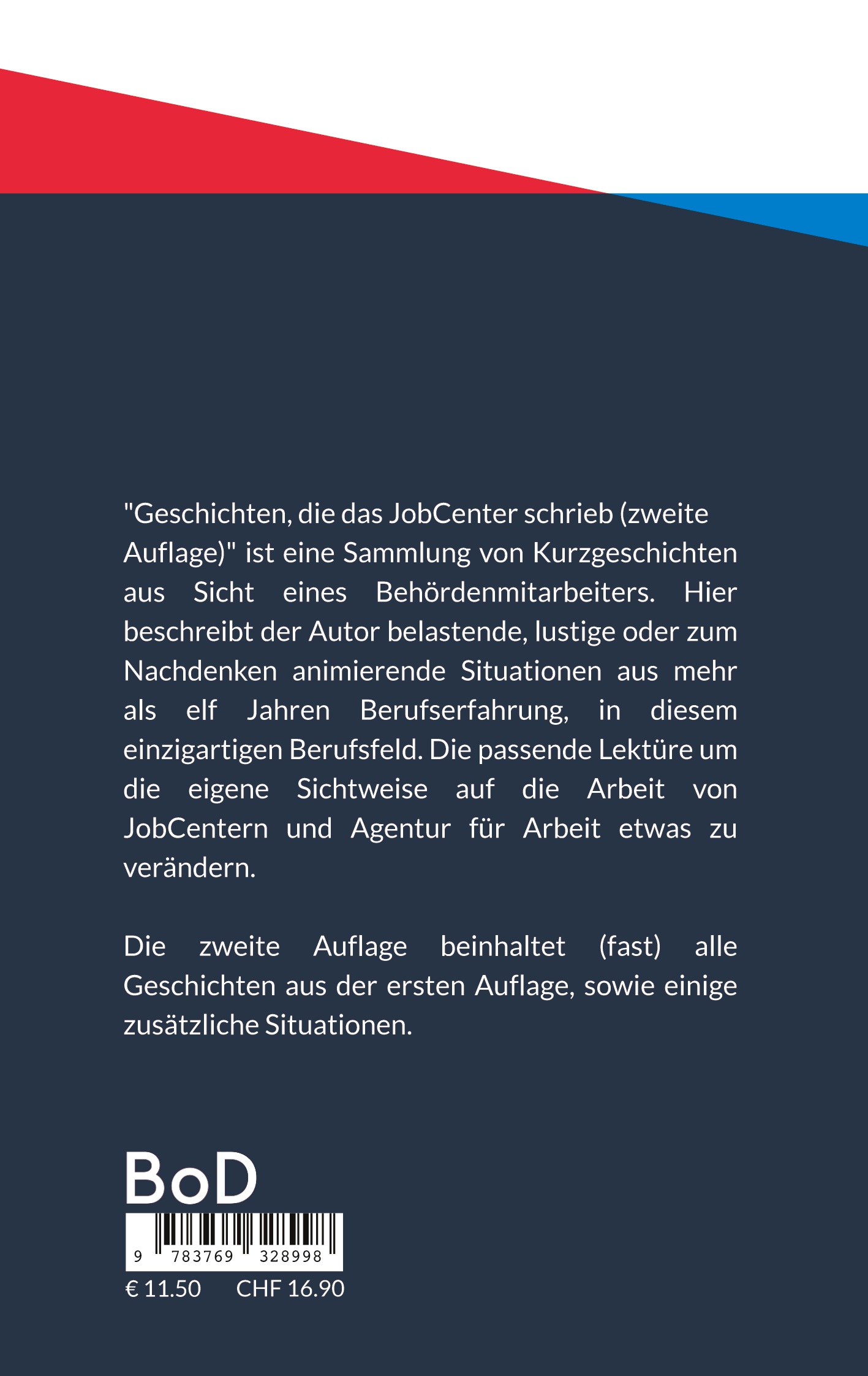 "Geschichten, die das JobCenter schrieb (zweite Auflage)" ist eine Sammlung von Kurzgeschichten aus Sicht eines Behördenmitarbeiters. Hier beschreibt der Autor belastende, lustige oder zum Nachdenken animierende Situationen aus mehr als elf Jahren Berufserfahrung, in diesem einzigartigen Berufsfeld. Die passende Lektüre, um die eigene Sichtweise auf die Arbeit von JobCentern und Agentur für Arbeit etwas zu verändern.