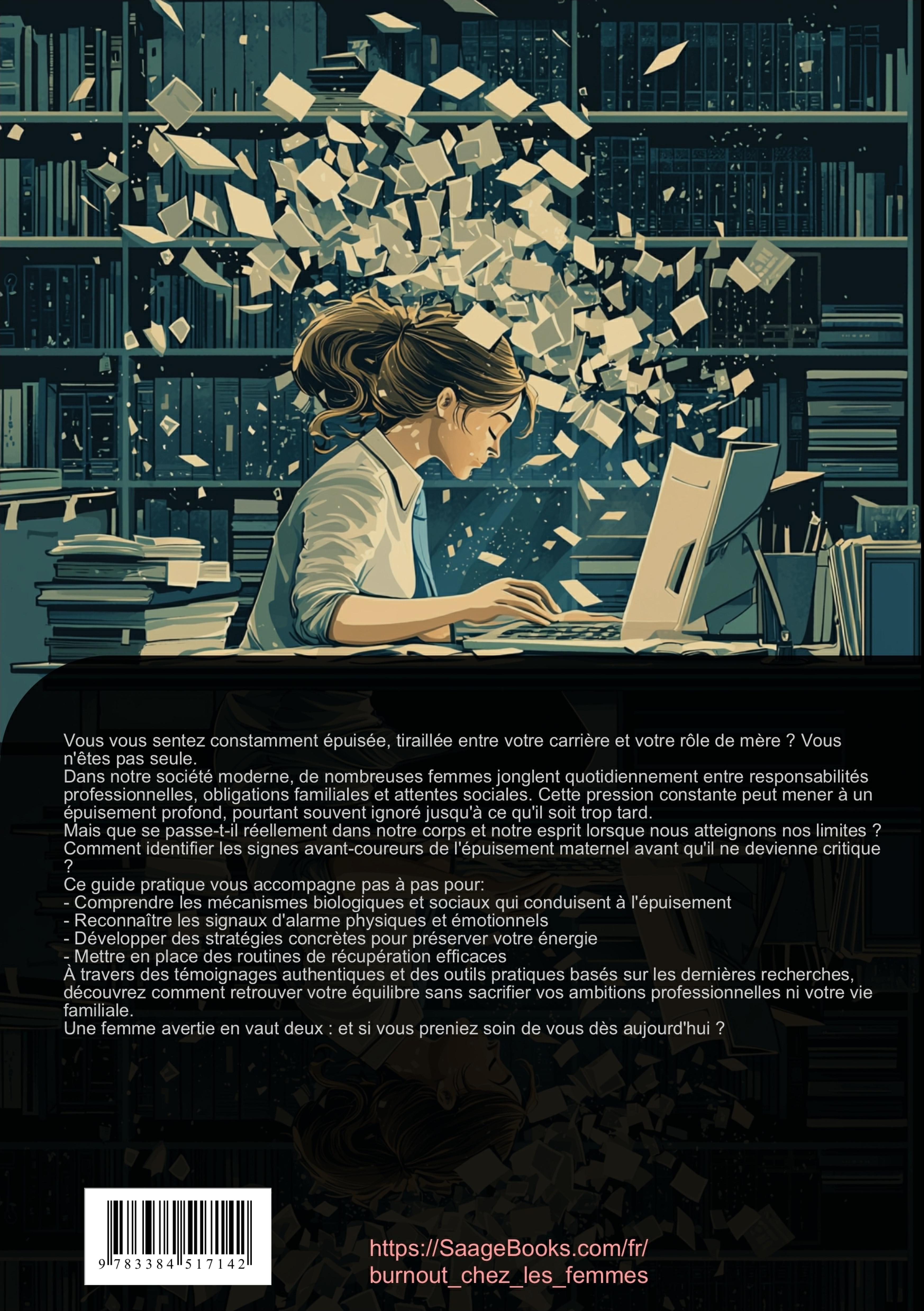 Dans notre société moderne, l'épuisement professionnel et maternel touche de plus en plus de femmes actives. Ce guide pratique aborde en profondeur les défis spécifiques auxquels font face les femmes confrontées à la double charge de la vie professionnelle et familiale.Structuré en cinq parties principales, ce livre analyse d'abord les causes et facteurs de risque, notamment la charge mentale liée à la gestion familiale, les attentes sociétales et les particularités biologiques féminines. Il propose ensuite des outils concrets pour identifier les signes précurseurs de l'épuisement professionnel chez les femmes.La partie prévention présente des stratégies pratiques pour maintenir l'équilibre, incluant des techniques de gestion du temps, des méthodes de relaxation et des conseils pour l'organisation quotidienne. Une attention particulière est portée à l'épuisement maternel et aux moyens de le prévenir.Le livre explore également les différentes options thérapeutiques disponibles, des approches psychologiques aux méthodes corporelles, en passant par l'accompagnement médical. Les lecteurs découvriront des solutions adaptées à leur situation personnelle.La dernière partie se concentre sur la construction d'un mode de vie durable, abordant le développement personnel, la gestion des relations familiales et l'évolution professionnelle. Des graphiques et illustrations viennent enrichir le contenu, permettant une meilleure compréhension des concepts présentés.Ce guide s'adresse aux femmes actives souhaitant prévenir ou surmonter l'épuisement professionnel et maternel, tout en maintenant un équilibre sain entre vie personnelle et professionnelle.Ce livre a été créé en utilisant des technologies innovantes telles que l'Intelligence Artificielle ainsi que des outils spécialement développés - par exemple, pour la recherche d'idées, la recherche d'informations, l'écriture, la relecture, l'assurance qualité et la conception d'illustrations décoratives.Ainsi, nous souhaitons vous offrir une expérience de lecture particulièrement cohérente, moderne et d'une qualité encore supérieure.
