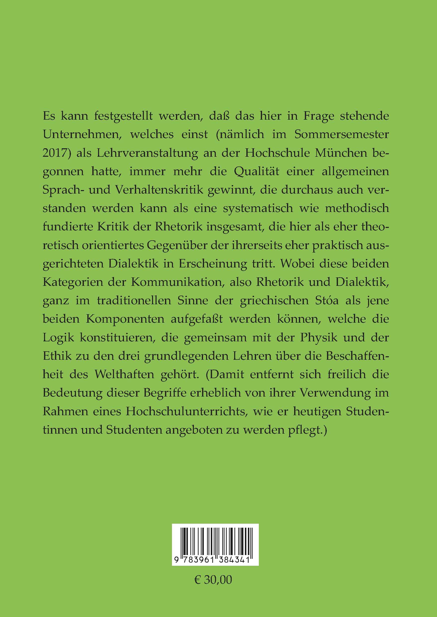Es kann festgestellt werden, daß das hier in Frage stehende Unternehmen, welches einst (nämlich im Sommersemester 2017) als Lehrveranstaltung an der Hochschule München begonnen hatte, immer mehr die Qualität einer allgemeinen Sprach- und Verhaltenskritik gewinnt, die durchaus auch verstanden werden kann als eine systematisch wie methodisch fundierte Kritik der Rhetorik insgesamt, die hier als eher theoretisch orientiertes Gegenüber der ihrerseits eher praktisch ausgerichteten Dialektik in Erscheinung tritt. Wobei diese beiden Kategorien der Kommunikation, also Rhetorik und Dialektik, ganz im traditionellen Sinne der griechischen Stóa als jene beiden Komponenten aufgefaßt werden können, welche die Logik konstituieren, die gemeinsam mit der Physik und der Ethik zu den drei grundlegenden Lehren über die Beschaffenheit des Welthaften gehört. (Damit entfernt sich freilich die Bedeutung dieser Begriffe erheblich von ihrer Verwendung im Rahmen eines Hochschulunterrichts, wie er heutigen Studentinnen und Studenten angeboten zu werden pflegt.)