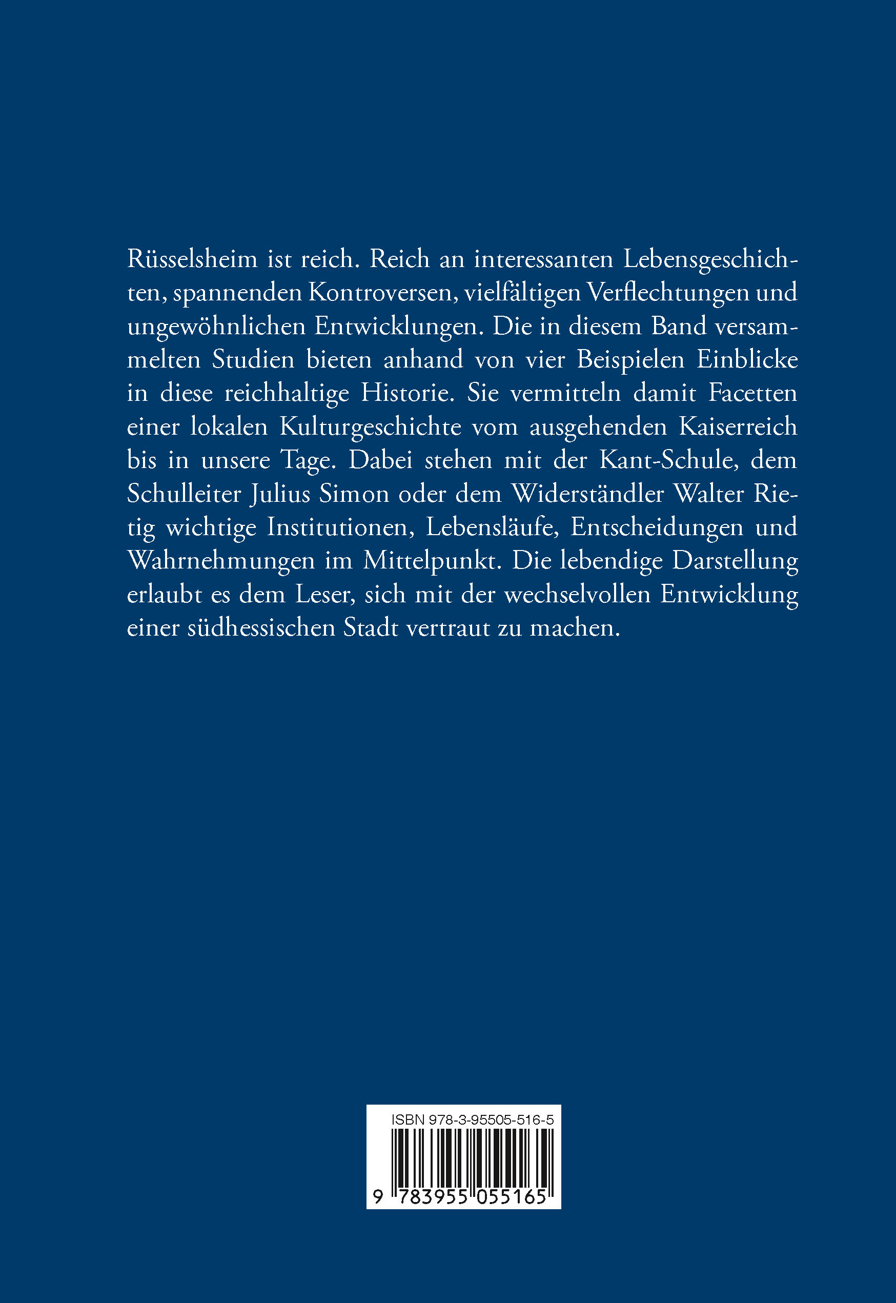 Rüsselsheim ist reich. Reich an interessanten Lebensgeschichten, spannenden Kontroversen, vielfältigen Verflechtungen und ungewöhnlichen Entwicklungen. Die in diesem Band versammelten Studien bieten anhand von vier Beispielen Ein blicke in diese reichhaltige Historie. Sie vermitteln damit Facetten einer lokalen Kulturgeschichte vom ausgehenden Kaiserreich bis in unsere Tage. Dabei stehen mit der Kant-Schule, dem Schulleiter Julius Simon oder dem Widerständler Walter Rietig wichtige Institutionen, Lebensläufe, Entscheidungen und Wahrnehmungen im Mittelpunkt. Die lebendige Darstellung erlaubt es dem Leser, sich mit der wechselvollen Entwicklung einer südhessischen Stadt vertraut zu machen.