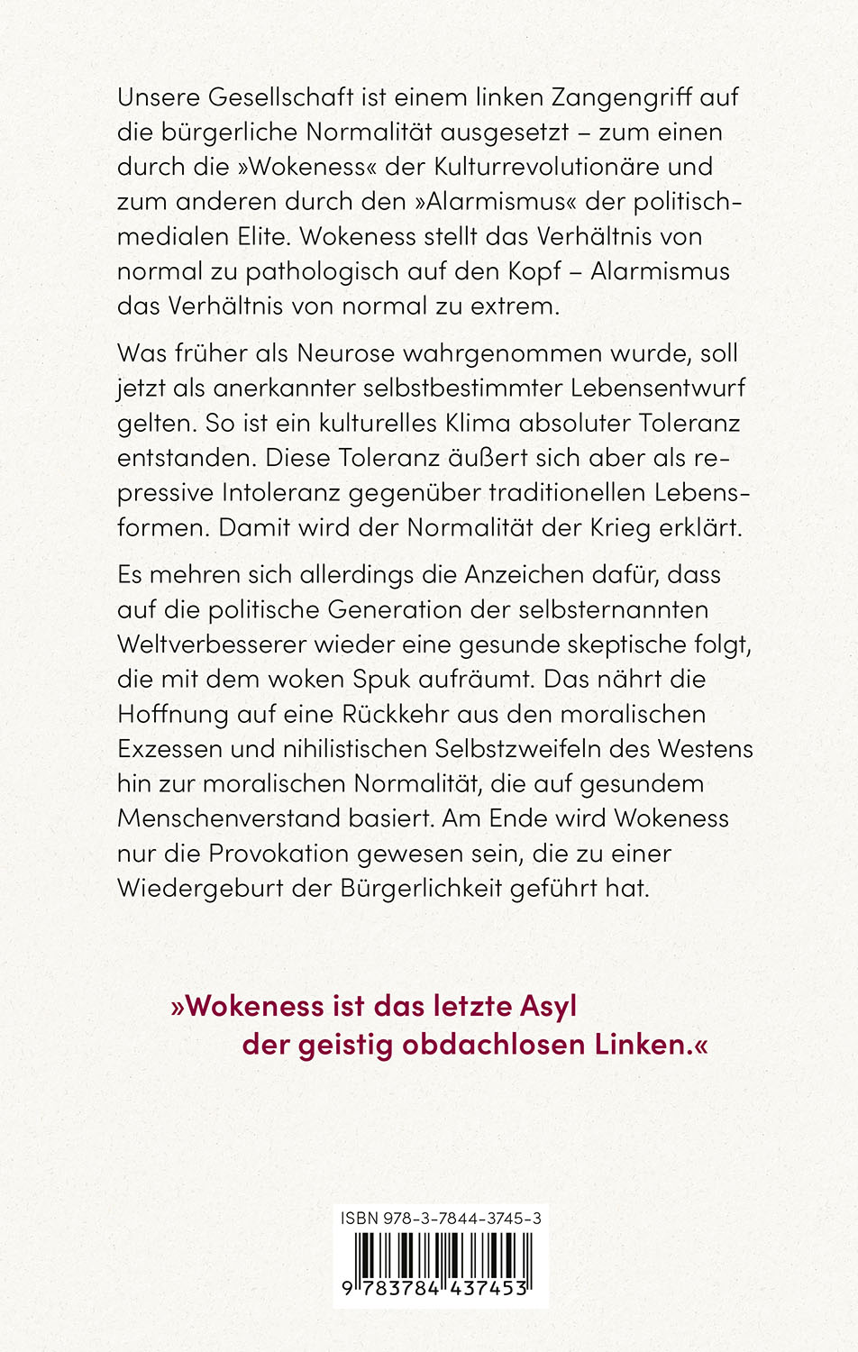 | Schlagworte | Bürgerlichkeit • Gefälligkeitswissenschaft • Intoleranz • Kulturrevolutionäre • Medien • Politik • politisch-mediale Elite • Sensationsjournalismuss • Toleranz • Wokeness |