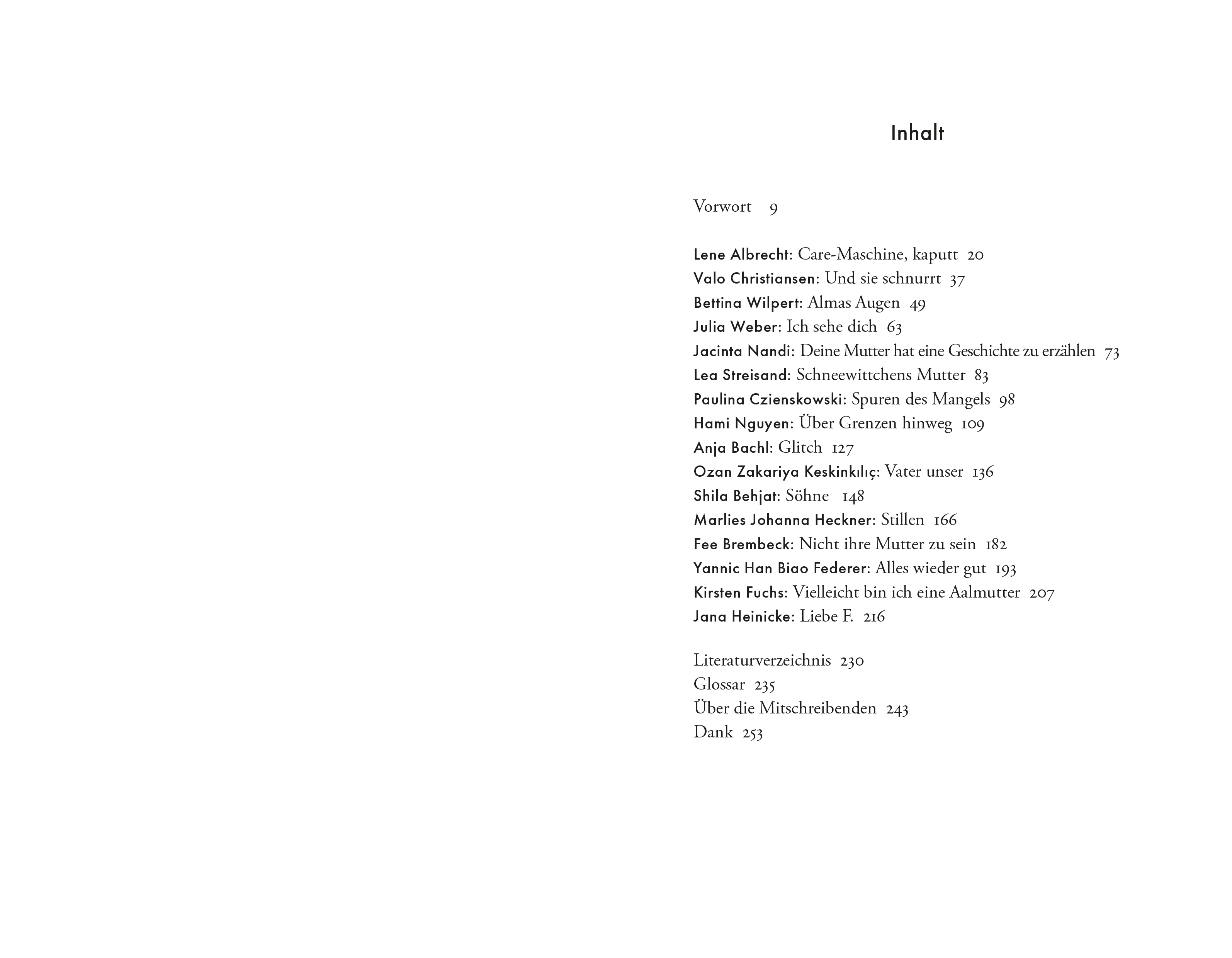 In den letzten Jahren sind viele Stimmen laut geworden, die unser geltendes Mutterideal hinterfragen. Dennoch steht die unbedingte Mutterliebe nach wie vor im Vordergrund und gilt als Motivation und Lohn für Care-Arbeit und Entschuldigung für Ungleichheit. Muttergefühle stehen synonym für ein einziges Gefühl, das über dreihundert Jahre den faktischen Blick auf das Muttersein versperrt und in rechtskonservativen Ideologien aktuell wieder Aufschwung erhält. Dabei ist es Zeit, die Gefühle von Eltern neu zu definieren und das Narrativ der immer glücklichen Mutter aufzubrechen und darzulegen, wie viele unterschiedliche und komplexe Emotionen zur Mutterschaft dazugehören - zu denen natürlich auch, aber eben nicht nur, Liebe und Glück zählen. Fünfzehn Autor*innen beschreiben in kurzen Texten, wie es ist, Mutter oder Eltern zu sein, und zeigen, was sich alles hinter dem Begriff Muttergefühle verbirgt.