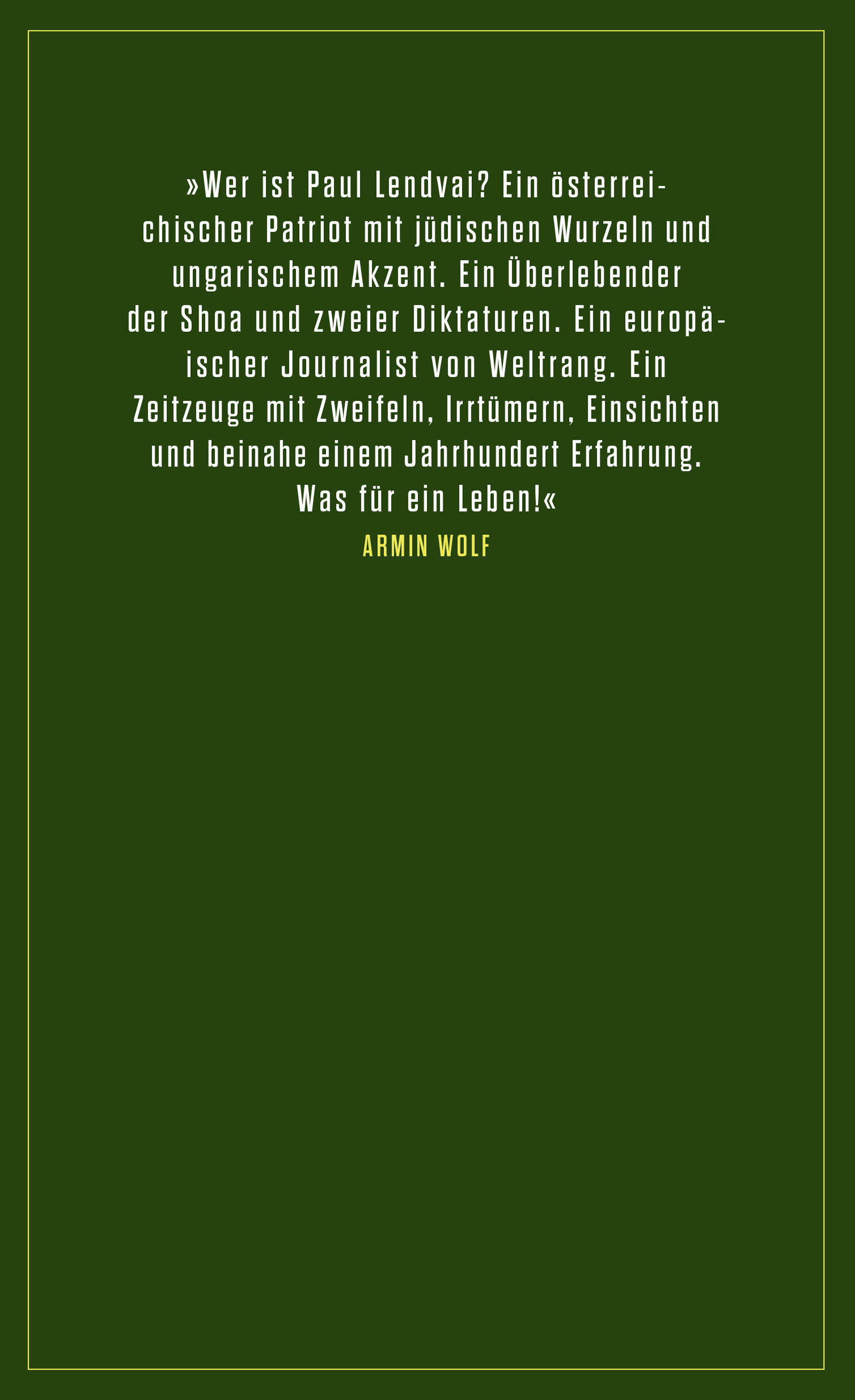 "Wer ist Paul Lendvai? Ein österreichischer Patriot mit jüdischen Wurzeln und ungarischem Akzent. Ein Überlebender der Shoa und zweier Diktaturen. Ein europäischer Journalist von Weltrang. Ein Zeitzeuge mit Zweifeln, Irrtümern, Einsichten und beinahe einem Jahrhundert Erfahrung. Was für ein Leben!" Armin Wolf