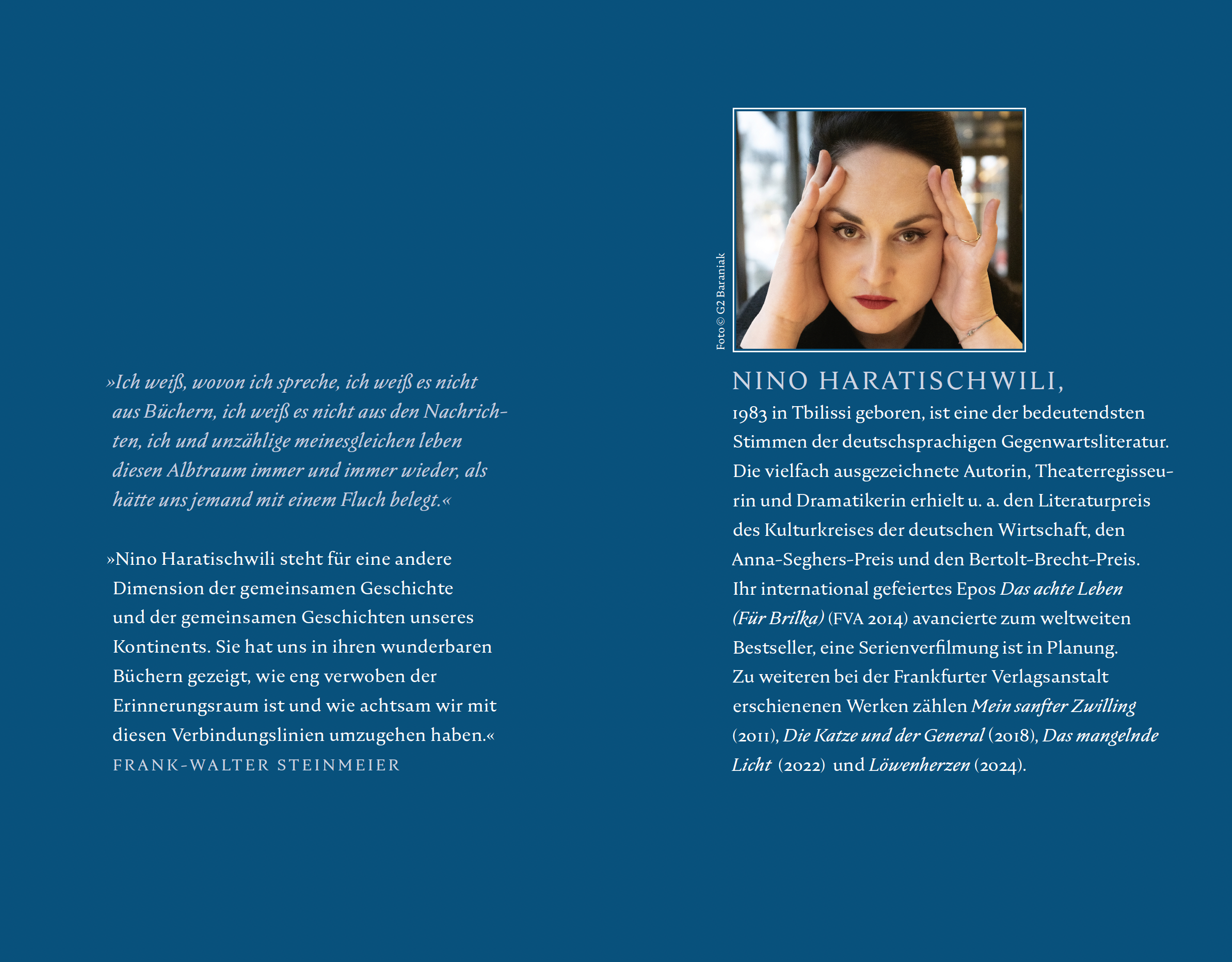 »Nino Haratischwili steht für eine andere Dimension der gemeinsamen Geschichte und der gemeinsamen Geschichten unseres Kontinents. Sie hat uns in ihren wunderbaren Büchern gezeigt, wie eng verwoben der Erinnerungsraum ist und wie achtsam wir mit diesen Verbindungslinien umzugehen haben.«