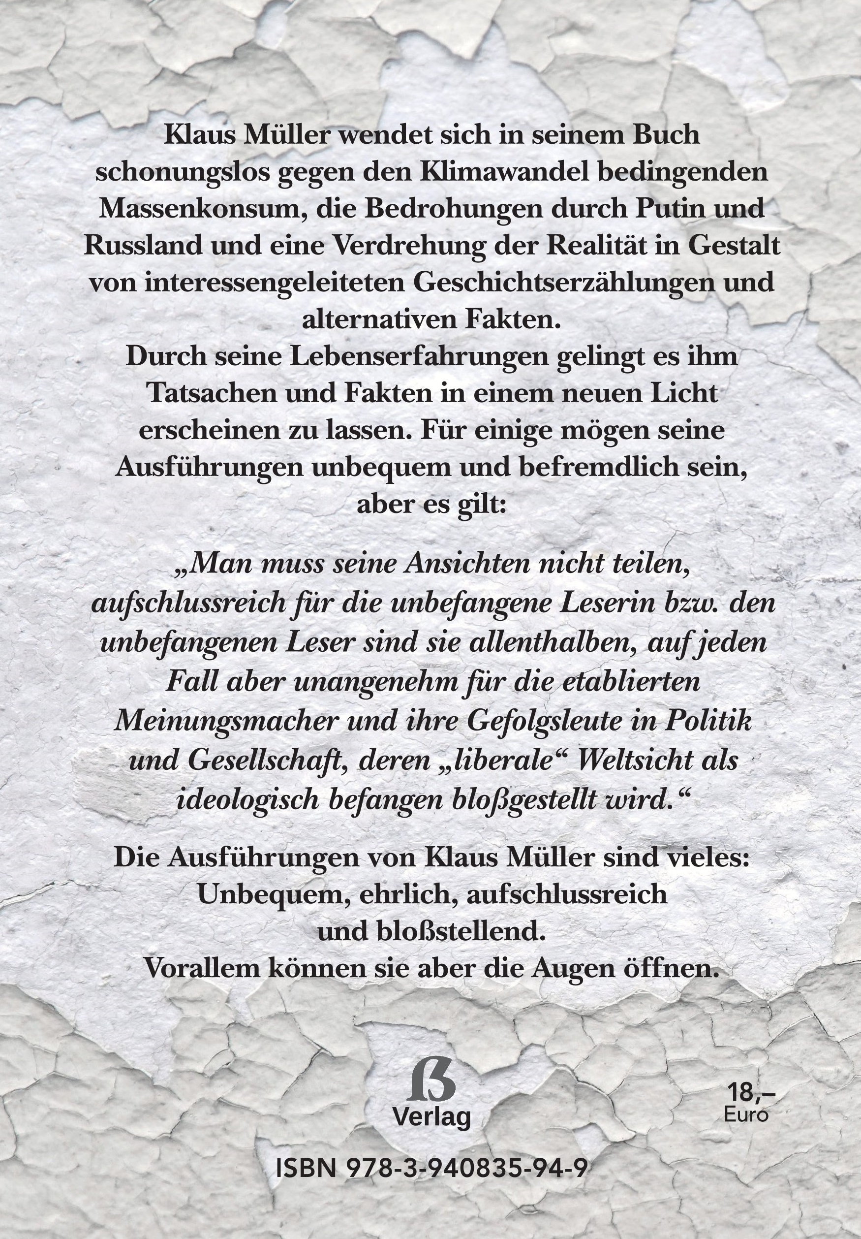 Klaus Müller wendet sich in seinem Buch schonungslos gegen den den Klimawandel bedingenden Massenkonsum, die Bedrohungen durch Putin und Russland und eine Verdehung der Realität in Gestalt von interessengeleiteten Geschichtserzählungen und alternativen Fakten. Durch seine Lebenserfahrung gelingt es ihm Tatsachen und Fakten in einem neuen Licht erscheinen zu lassen.