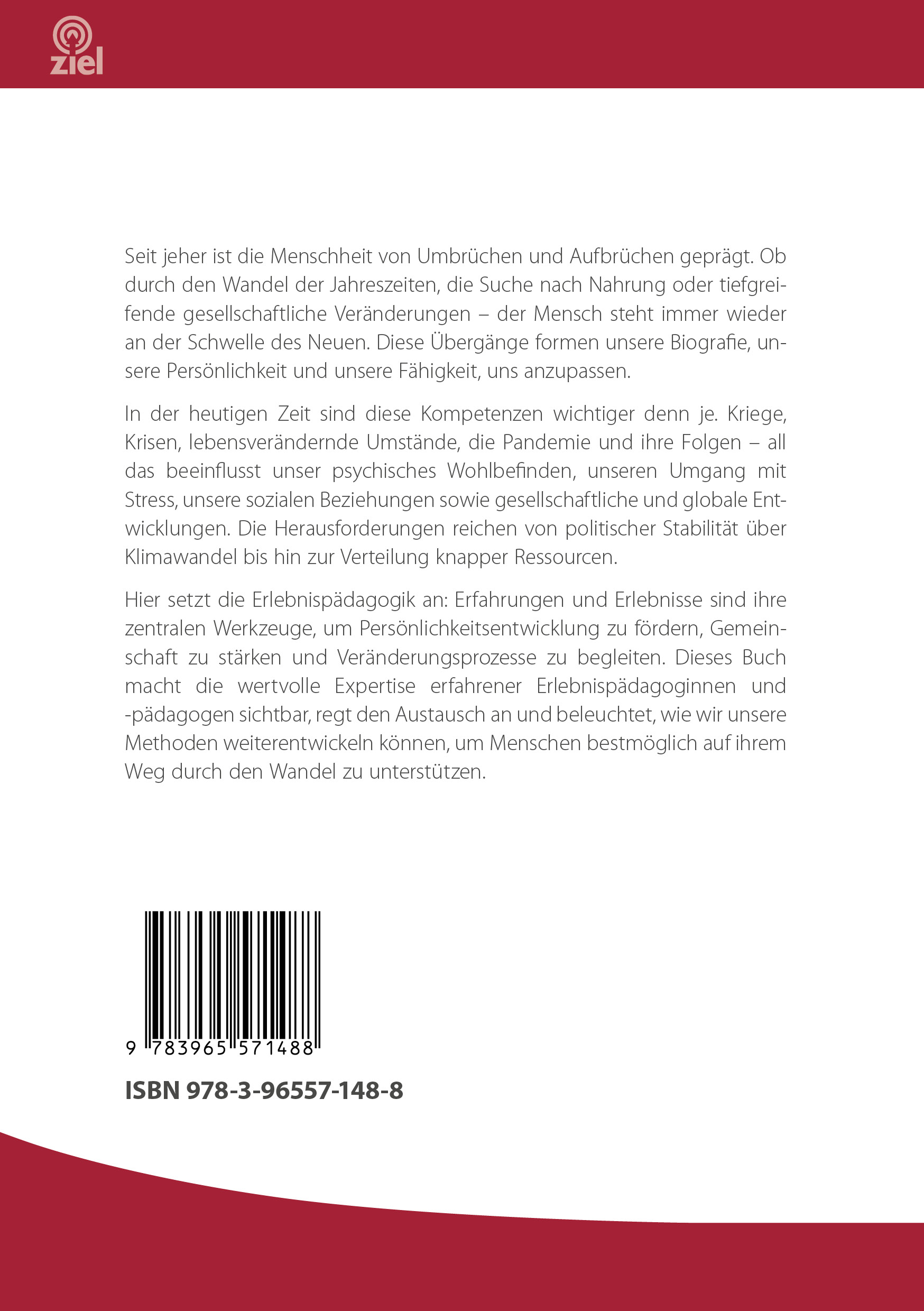 Hier setzt die Erlebnispädagogik an: Erfahrungen und Erlebnisse sind ihre zentralen Werkzeuge, um Persönlichkeitsentwicklung zu fördern, Gemeinschaft zu stärken und Veränderungsprozesse zu begleiten. Dieses Buch macht die wertvolle Expertise erfahrener Erlebnispädagoginnen und -pädagogen sichtbar, regt den Austausch an und beleuchtet, wie wir unsere Methoden weiterentwickeln können, um Menschen bestmöglich auf ihrem Weg durch den Wandel zu unterstützen.