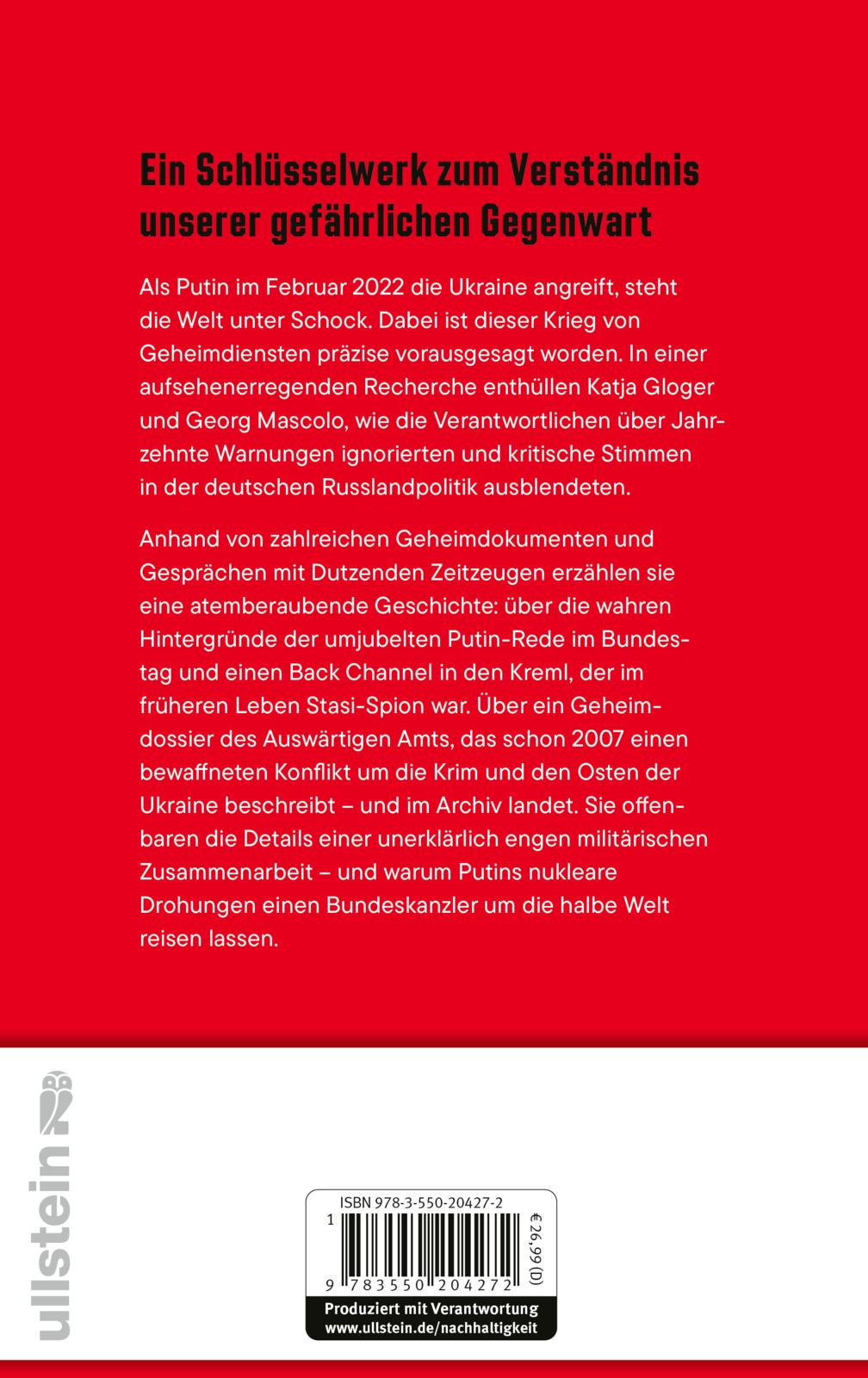 Anhand von zahlreichen Geheimdokumenten und Gesprächen mit Dutzenden Zeitzeugen erzählen sie eine atemberaubende Geschichte: über die wahren Hintergründe der umjubelten Putin-Rede im Bundestag und einen Back Channel in den Kreml, der im früheren Leben Stasi-Spion war. Über ein Geheimdossier des Auswärtigen Amts, das schon 2007 einen bewaffneten Konflikt um die Krim und den Osten der Ukraine beschreibt – und im Archiv landet. Sie offenbaren die Details einer unerklärlich engen militärischen Zusammenarbeit – und warum Putins nukleare Drohungen einen Bundeskanzler um die halbe Welt reisen lassen.