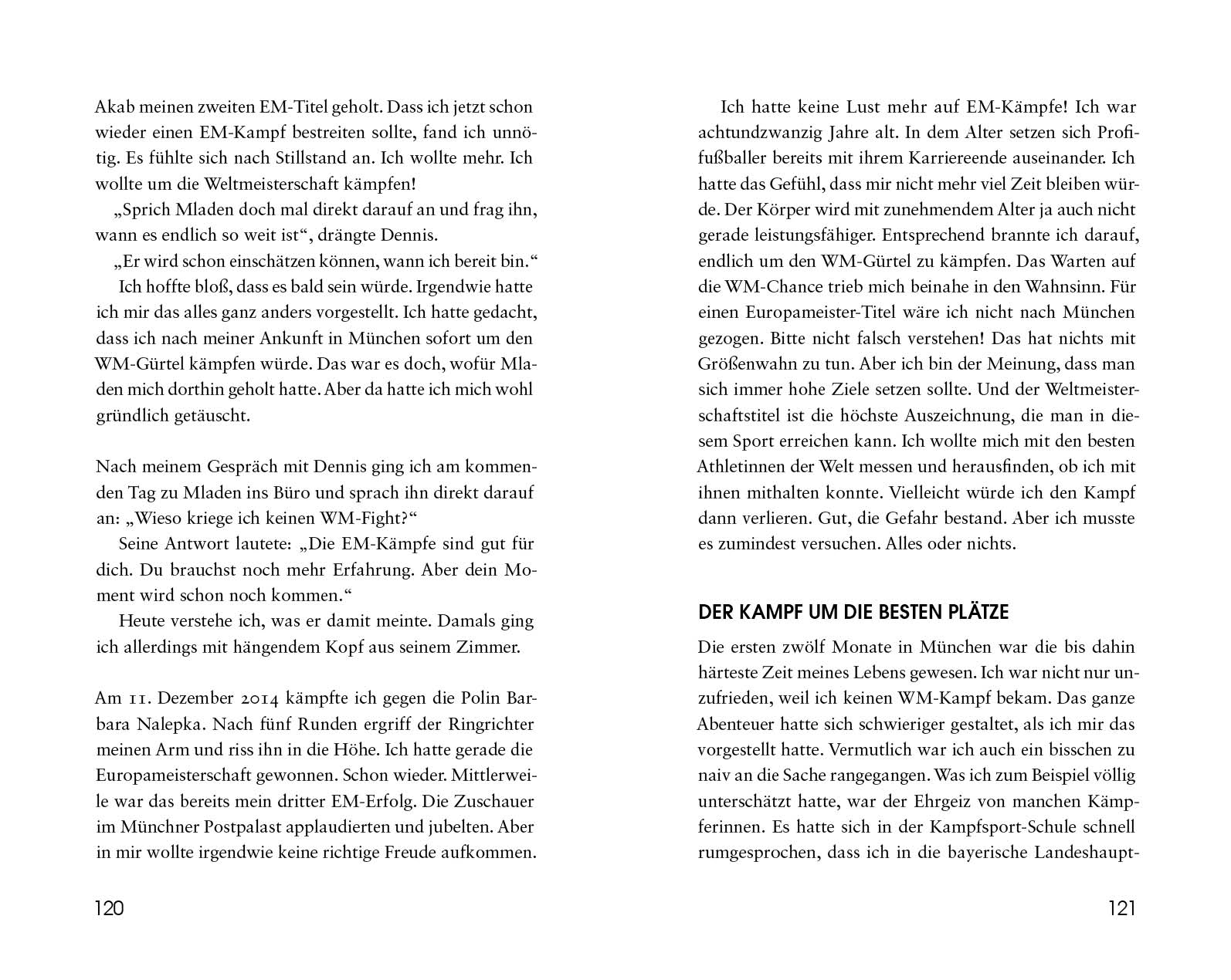 Die Rekord-Meisterin im Kickboxen schreibt in ihrem Buch erstmals darüber, wie sie es geschafft hat, an die Spitze zu kommen. Was sie gestärkt hat. Welche Hindernisse sie überwinden musste, und dass sie nicht nur im Ring, sondern auch außerhalb ihre Fights zu kämpfen hatte: Gegen Angstzustände, Depressionen und Sexismus. Und was sie daraus für's Leben lernte.