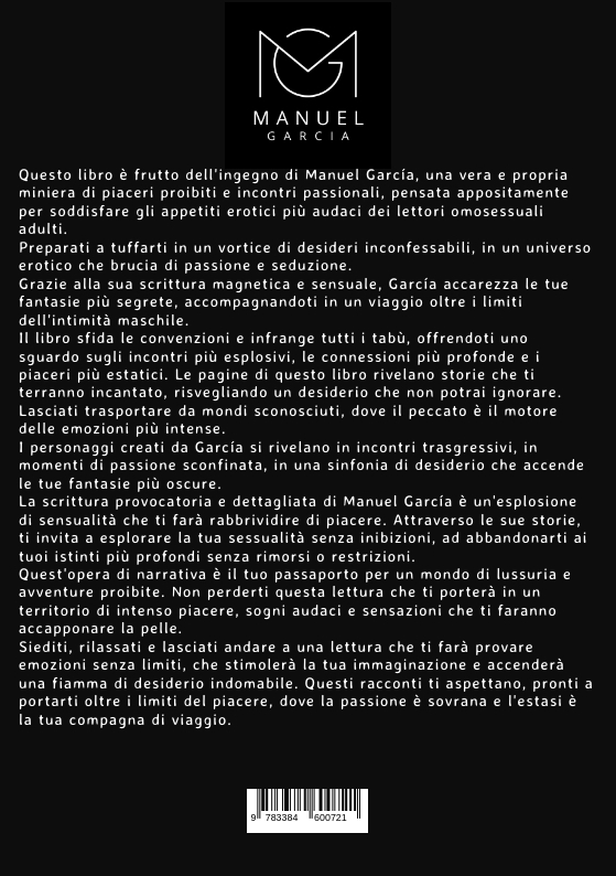 Manuel García è un autore audace e provocatorio nel panorama letterario erotico gay. Nato in una piccola città costiera, ha sempre avuto una forte passione per la scrittura e una vivida immaginazione che lo ha spinto a esplorare gli angoli più oscuri dell'intimità maschile. Fin da giovane, Manuel ha sentito la chiamata a liberarsi dalle catene delle convenzioni sociali, a sfidare i tabù e a dare voce ai desideri inconfessabili degli uomini gay. Attraverso la sua scrittura sensuale e coinvolgente, ha creato un mondo letterario unico in cui erotismo e piacere si intrecciano con il desiderio di libertà e di esplorazione personale. Il suo lavoro porta i lettori oltre i limiti della normalità, immergendoli in un universo intenso e provocatorio dove le barriere vengono abbattute e i desideri più nascosti possono finalmente emergere. Manuel cerca di coinvolgere emotivamente i suoi lettori, di farli risuonare con le sue parole e di creare un legame profondo attraverso le pagine dei suoi libri. Con il suo stile incisivo e la capacità di catturare l'essenza dei momenti erotici, Manuel García è diventato una voce di spicco nel genere dell'erotismo gay. Che si tratti di racconti o di romanzi, le sue opere sono amate da un vasto pubblico di uomini gay adulti che cercano una lettura che vada oltre il semplice intrattenimento, stimolandoli intellettualmente e coinvolgendoli emotivamente. Manuel si è guadagnato una reputazione per la sua onestà e audacia nel trattare argomenti tabù, sempre con rispetto e sensibilità verso i suoi personaggi. I suoi scritti sono un invito a esplorare il mondo dell'erotismo, a liberare la propria sessualità e ad abbracciare pienamente i piaceri della vita. Oltre a essere un autore di successo, Manuel García è anche un sostenitore dei diritti LGBT+, promuovendo attivamente l'accettazione e la diversità attraverso la sua arte. Il suo obiettivo è aprire le menti, sfidare i pregiudizi e creare un mondo in cui l'amore e il desiderio siano liberi da discriminazioni e restrizioni. Con il suo talento innato e la sua passione per la scrittura erotica gay, Manuel García continua a influenzare il genere letterario, ispirando e intrattenendo i lettori di tutto il mondo con le sue storie accattivanti, sensuali e indimenticabili.