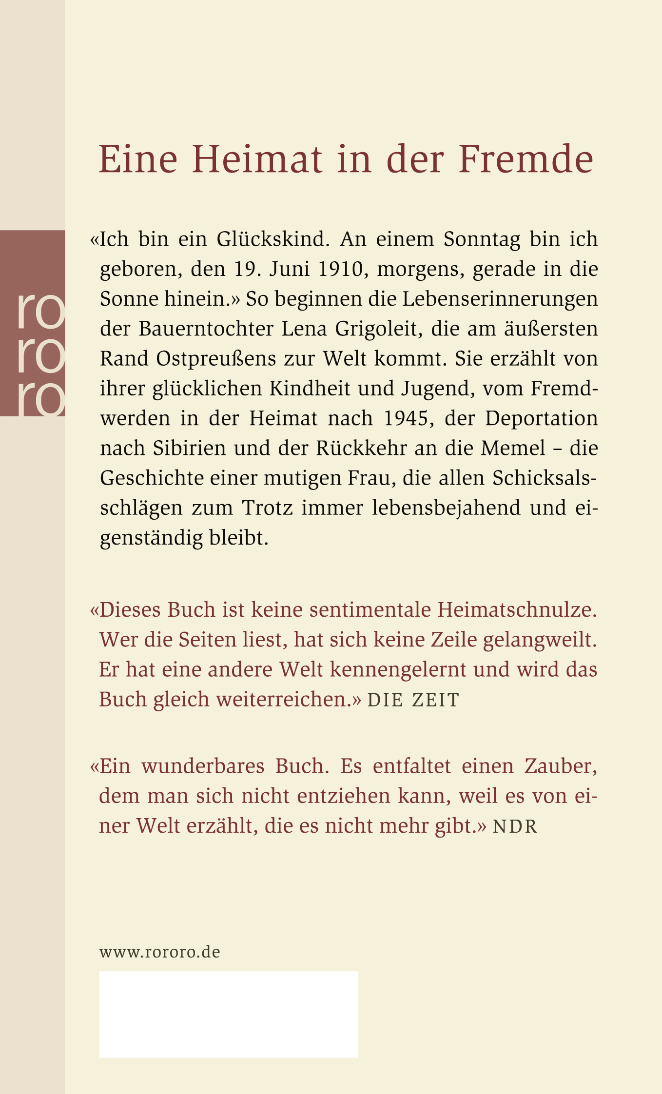lt;p>"Ich bin ein Glückskind. An einem Sonntag bin ich geboren, den 19. Juni 1910, morgens, gerade in die Sonne hinein." So beginnen die Lebenserinnerungen der Bauerntochter Lena Grigoleit, die am äußersten Rand Ostpreußens zur Welt kommt. Sie erzählt von ihrer glücklichen Kindheit und Jugend, vom Fremdwerden in der Heimat nach 1945, der Deportation nach Sibirien und der Rückkehr an die Memel - die Geschichte einer mutigen Frau, die allen Schicksalsschlägen zum Trotz immer lebensbejahend und eigenständig bleibt.