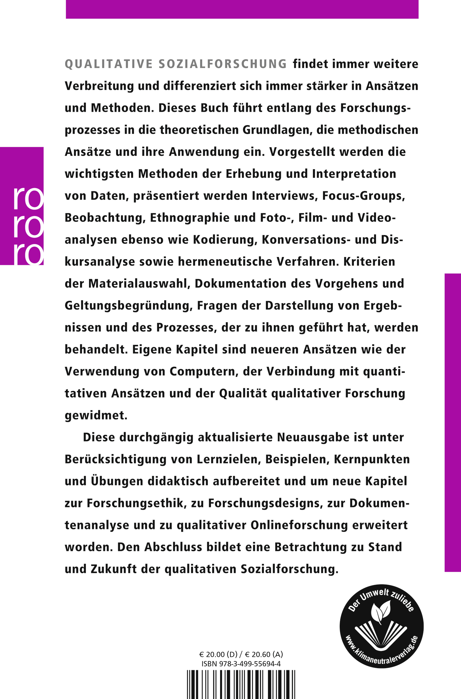 Diese durchgängig aktualisierte Neuausgabe ist unter Berücksichtigung von Lernzielen, Beispielen, Kernpunkten und Übungen didaktisch aufbereitet und um neue Kapitel zur Forschungsethik, zu Forschungsdesigns, zur Dokumentenanalyse und zu qualitativer Onlineforschung erweitert worden. Den Abschluss bildet eine Betrachtung zu Stand und Zukunft der qualitativen Sozialforschung.