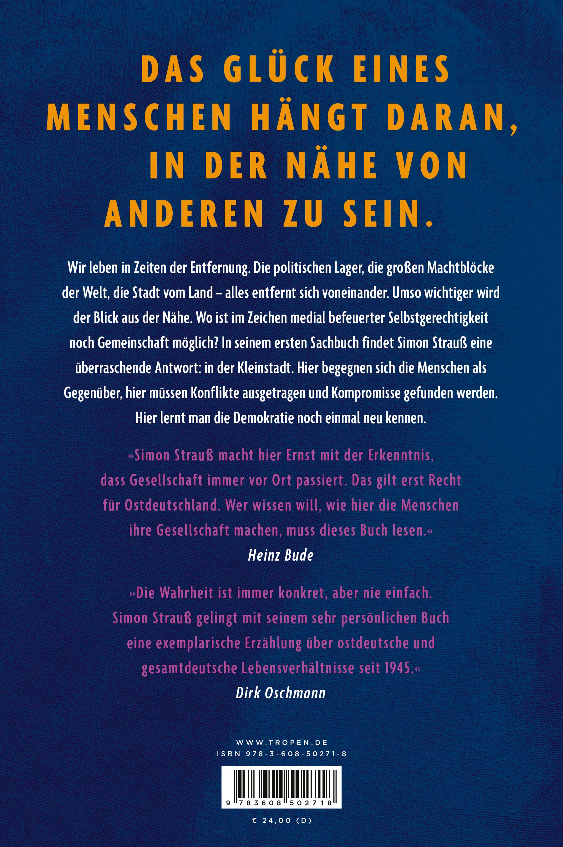 »Simon Strauß macht hier Ernst mit der Erkenntnis, dass Gesellschaft immer vor Ort passiert. Das gilt erst Recht für Ostdeutschland. Wer wissen will, wie hier die Menschen ihre Gesellschaft machen, muss dieses Buch lesen.« Heinz Bude