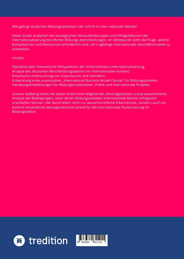 Wie gelingt deutschen Bildungsanbietern der Schritt in internationale Märkte?Diese Studie analysiert die strategischen Herausforderungen und Erfolgsfaktoren der Internationalisierung beruflicher Bildungsdienstleistungen. Im Mittelpunkt steht die Frage, welche Kompetenzen und Ressourcen erforderlich sind, um tragfähige internationale Geschäftsmodelle zu entwickeln.- Überblick über theoretische Perspektiven der Unternehmensinternationalisierung- Analyse des deutschen Berufsbildungssektors im internationalen Kontext- Empirische Untersuchung von Exporteuren und Intendern mit quantitativen und qualitativen Methoden- Entwicklung eines praxisnahen "International Business Model Canvas" für Bildungsanbieter- Handlungsempfehlungen für Bildungsinstitutionen, Politik und internationale Kooperationsprojekte