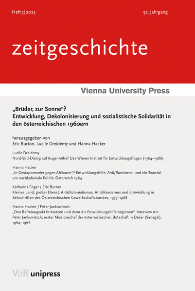 Kalter Krieg, Befreiungsbewegungen im Globalen Süden, Bürgerrechtsbewegungen in den USA und die Entwicklungspolitik als neues weltumspannendes Handlungsfeld: All das sind Bezugspunkte inter- und transnationaler Politiken im Österreich der späten 1950er- und 1960er-Jahre. Es entstanden entwicklungspolitisch orientierte ministerielle Gremien und staatsnahe Institutionen ebenso wie eine ganze Reihe an vielfach kirchlich getragenen Nicht-Regierungsorganisationen, die sich mit Entwicklungszusammenarbeit befassten. Teilweise in einem Spannungsverhältnis dazu entfalteten sich Kooperationen zwischen Aktivist:innen beispielsweise der panafrikanischen Schwarzen Diaspora und solchen der sich als kosmopolitisch verstehenden Linken. Das vorliegende Themenheft geht der Frage nach, wie sich Akteur:innen, die der Sozialdemokratie zugerechnet werden können, im Feld dieser neuen Beziehungsmuster verorteten und welche Handlungsentwürfe damit einhergingen. Die Beiträge eröffnen Perspektiven zu globalen und post/kolonialen Dimensionen der österreichischen Zeitgeschichte.