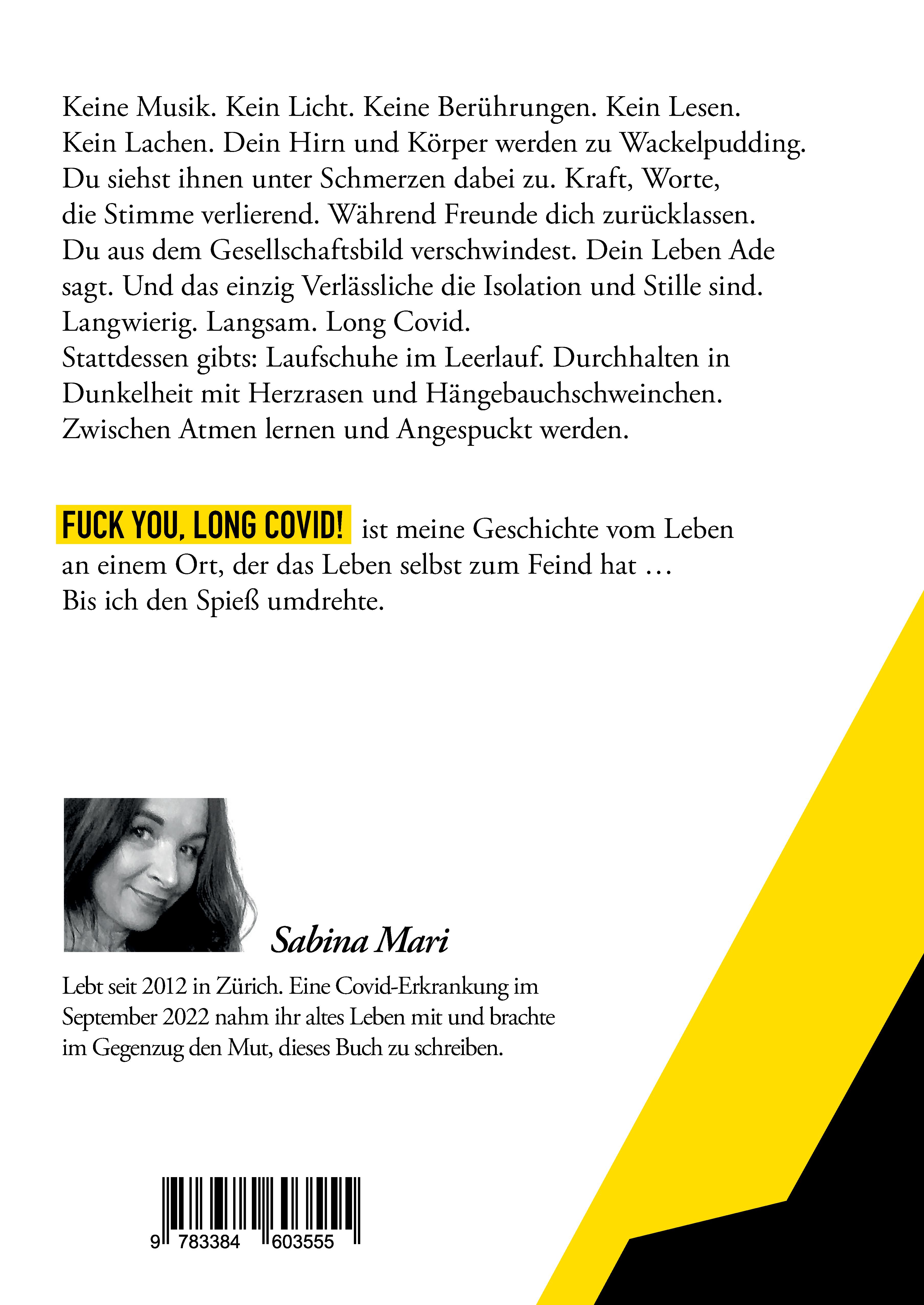 Sabina Mari (*1975) lebt seit 2012 in Zürich. Bei der Geburt gaben ihr die Ärzte 24 Stunden Lebenszeit. Den Ärzten von damals und ihrer Long-Covid- und CFS-Diagnose zum Trotz gibt sie mit „Fuck you, Long Covid!“ 50-jährig – und überaus lebendig – ihr Buchdebüt. Die Faszination für die Möglichkeit, schreibend Bilder zu zeichnen, wurde bereits früh genährt. Das Fundament legte die Flucht aus ihrem Geburtsland Polen Anfang der 1980er-Jahre. Deutschland und Deutsch, eine fremde Sprache in einer fremden neuen Welt hießen sie mit „Die ist anders!“, dem ersten Satz, den sie verstand und erinnert, willkommen. Drei Wörter, ein sehr klares Bild. Sie blieb. Und las. Und schrieb. Eine Ausbildung zum Barbier, 5 Jahre in diesem Beruf und 25 Jahre internationale Arbeit als selbstständige Gestalterin für visuelles Marketing folgten. Zudem 10 Jahre davon als Texterin für einige ihrer Kunden. Zürich wurde 2012 ein Zuhause, Berlin blieb die Heimat im Herzen. Lange Geschichte. Mit dem Bewältigen ihrer LC-/CFS-Erkrankung begann ein neues Kapitel und wuchs der Wunsch, sich zukünftig ihren beiden großen Leidenschaften zu widmen: der ayurvedischen Küche und dem Schreiben. Zwei weitere Bücher warten bereits auf einen Abschluss.