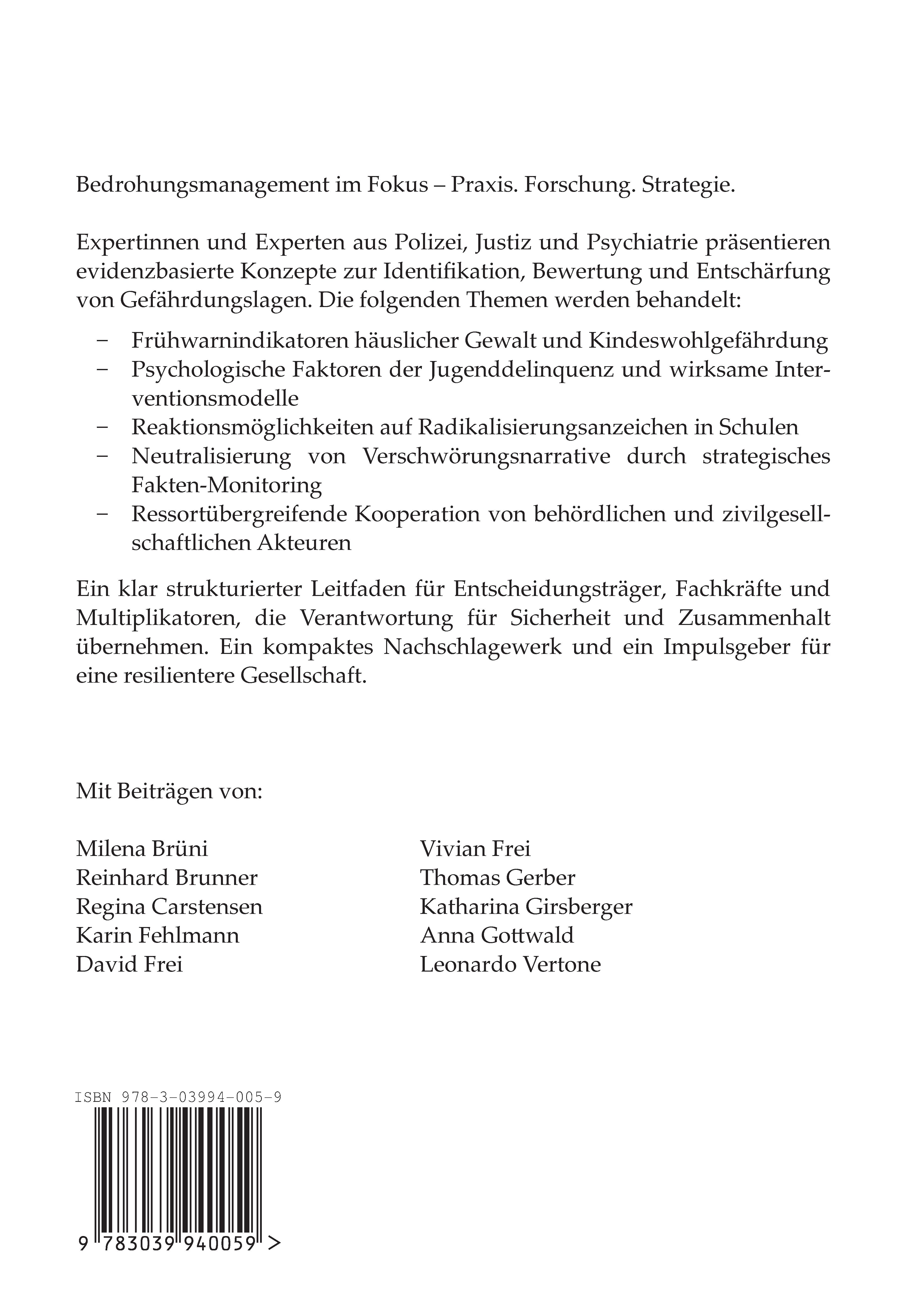 Bedrohungsmanagement im Fokus - Praxis. Forschung. Strategie.Expertinnen und Experten aus Polizei, Justiz und Psychiatrie präsentieren evidenzbasierte Konzepte zur Identifikation, Bewertung und Entschärfung von Gefährdungslagen. Die folgenden Themen werden behandelt:- Frühwarnindikatoren häuslicher Gewalt und Kindeswohlgefährdung- Psychologische Faktoren der Jugenddelinquenz und wirksame Interventionsmodelle- Reaktionsmöglichkeiten auf Radikalisierungsanzeichen in Schulen- Neutralisierung von Verschwörungsnarrative durch strategisches Fakten-Monitoring- Ressortübergreifende Kooperation von behördlichen und zivilgesellschaftlichen AkteurenEin klar strukturierter Leitfaden für Entscheidungsträger, Fachkräfte und Multiplikatoren, die Verantwortung für Sicherheit und Zusammenhalt übernehmen. Ein kompaktes Nachschlagewerk und ein Impulsgeber für eine resilientere Gesellschaft.