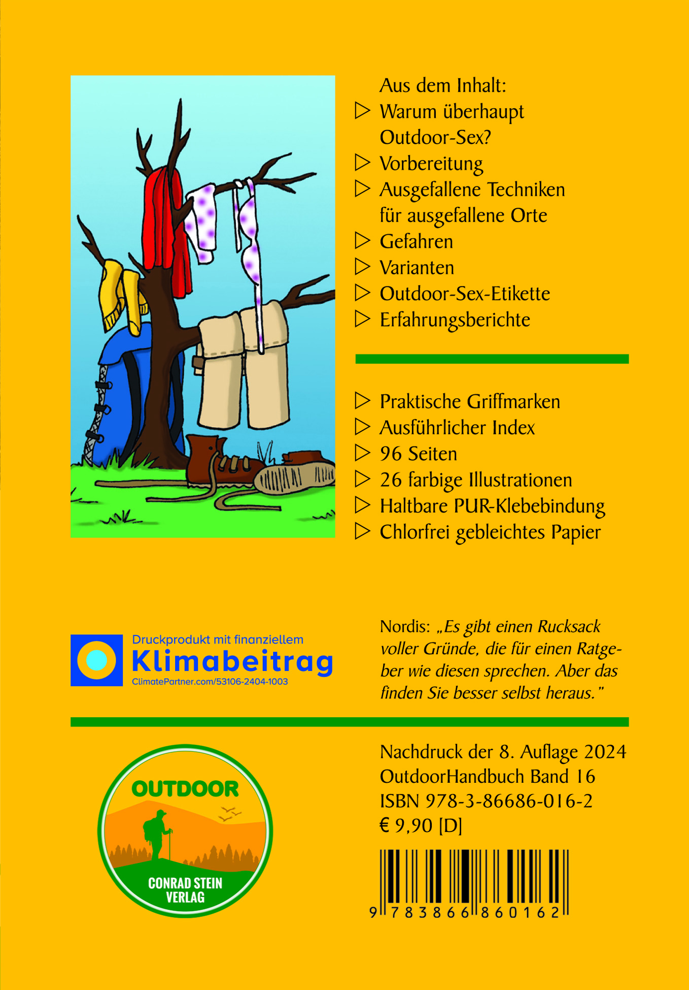 Mit viel Einsatz und Mühe haben die beiden Autoren die immer wieder gestellte Frage "Warum überhaupt Outdoor-Sex?" mit zwei zwinkernden Augen zu beantworten versucht. Denn obwohl es zugegebenermaßen mehr Spaß machen kann, selbst herumzuexperimentieren, gibt es doch einen Rucksack voll guter Gründe, die für einen Ratgeber wie diesen sprechen. Die Autoren jedenfalls haben viel Spaß bei der Recherche zu diesem Buch für fast alle Liebeslagen im Outdoor gehabt und geben ihre Erfahrungen humorvoll weiter. Trotzdem ist der kleine Hinweis wohl angebracht: Der Bundesminister für draußen warnt - Sex ist gut für die Gesundheit.