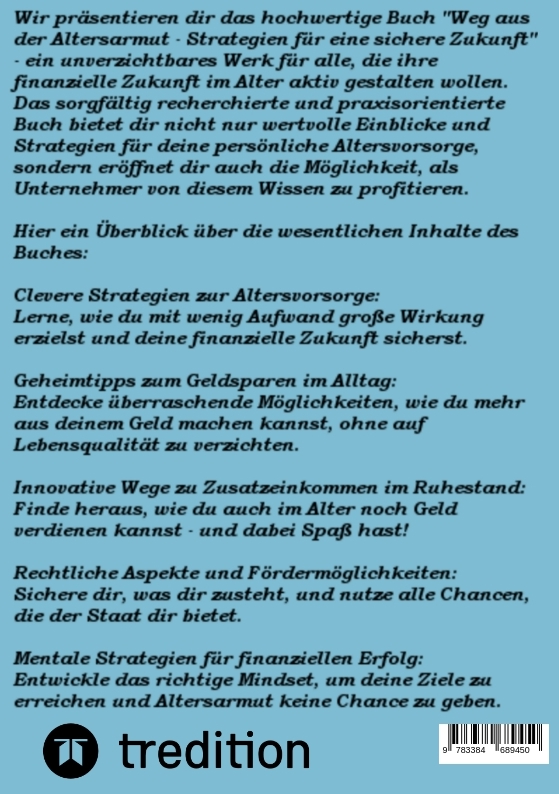 Das Buch "Weg aus der Altersarmut - Strategien für eine sichere Zukunft" widmet sich einem drängenden gesellschaftlichen Thema: der finanziellen Unsicherheit im Alter und den konkreten Wegen, wie man dieser vorbeugen kann. Es bietet praxisnahe Strategien, um Altersarmut zu vermeiden und eine stabile finanzielle Basis für den Ruhestand zu schaffen.