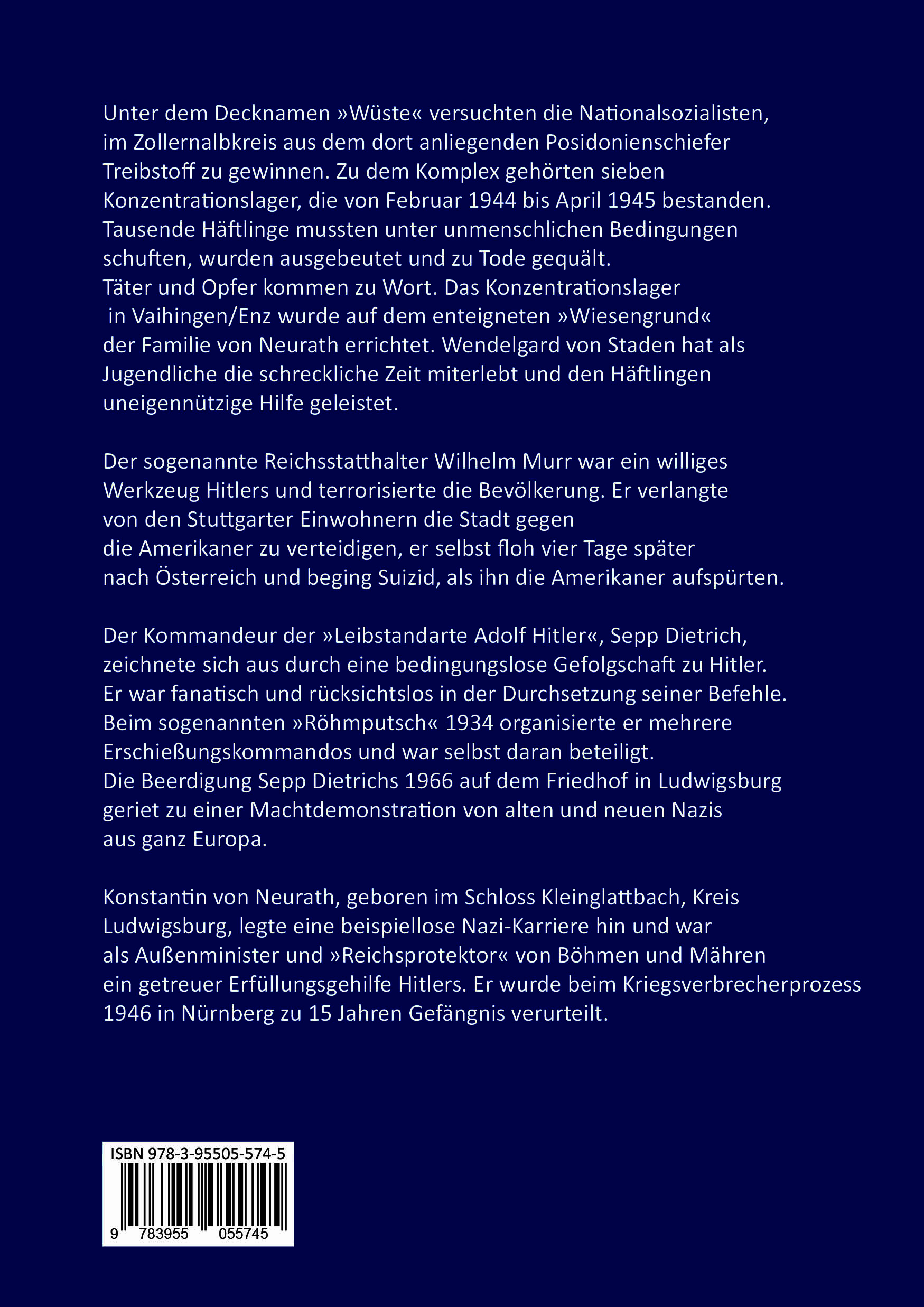 Unter dem Decknamen »Wüste« versuchten die Nationalsozialisten, im Zollernalbkreis aus dem dort anliegenden Posidonienschiefer Treibstoff zu gewinnen. Zu dem Komplex gehörten sieben Konzentrationslager, die von Februar 1944 bis April 1945 bestanden. Tausende Häftlinge mussten unter unmenschlichen Bedingungen schuften, wurden ausgebeutet und zu Tode gequält. Täter und Opfer kommen zu Wort. Das Konzentrationslager in Vaihingen/Enz wurde auf dem enteigneten »Wiesengrund« der Familie von Neurath errichtet. Wendelgard von Staden hat als Jugendliche die schreckliche Zeit miterlebt und den Häftlingen uneigennützige Hilfe geleistet. Der sogenannte Reichsstatthalter Wilhelm Murr war ein williges Werkzeug Hitlers und terrorisierte die Bevölkerung. Er verlangte von den Stuttgarter Einwohnern die Stadt gegen die Amerikaner zu verteidigen, er selbst floh vier Tage später nach Österreich und beging Suizid, als ihn die Amerikaner aufspürten. Der Kommandeur der »Leibstandarte Adolf Hitler«, Sepp Dietrich, zeichnete sich aus durch eine bedingungslose Gefolgschaft zu Hitler. Er war fanatisch und rücksichtslos in der Durchsetzung seiner Befehle. Beim sogenannten »Röhmputsch« 1934 organisierte er mehrere Erschießungskommandos und war selbst daran beteiligt. Die Beerdigung Sepp Dietrichs 1966 auf dem Friedhof in Ludwigsburg geriet zu einer Machtdemonstration von alten und neuen Nazis aus ganz Europa. Konstantin von Neurath, geboren im Schloss Kleinglattbach, Kreis Ludwigsburg, legte eine beispiellose Nazi-Karriere hin und war als Außenminister und »Reichsprotektor« von Böhmen und Mähren ein getreuer Erfüllungsgehilfe Hitlers. Er wurde beim Kriegsverbrecherprozess 1946 in Nürnberg zu 15 Jahren Gefängnis verurteilt.