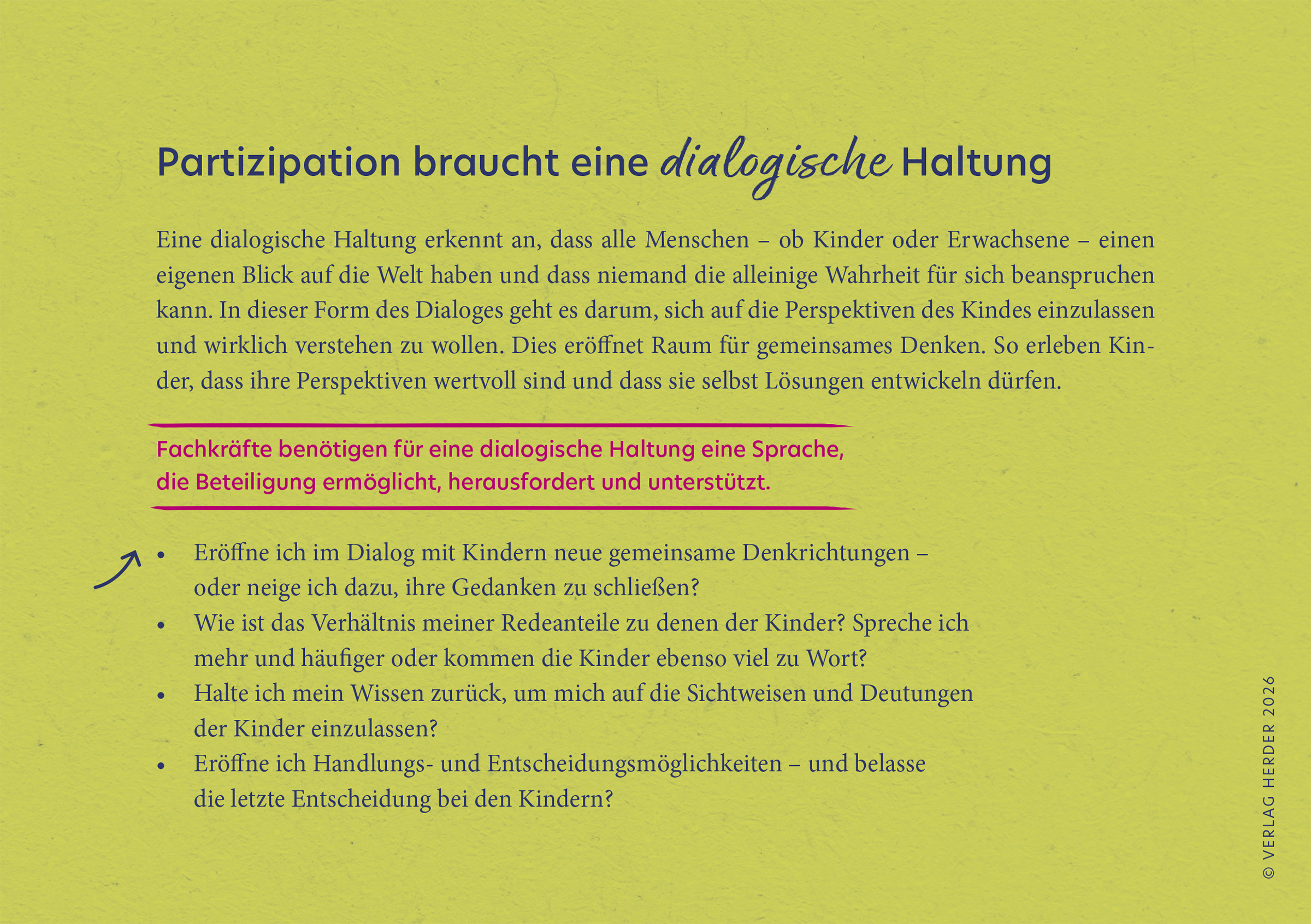 Kinder haben ein Recht auf Partizipation. Doch was genau meint Partizipation? Wie gelingt es in der Praxis, Kinder wirklich zu beteiligen und mitbestimmen zu lassen? Welche Voraussetzungen sind hierfür nötig? Die Reflexionskarten bieten die Möglichkeit, Grundlagenwissen zum Thema Partizipation zu erarbeiten oder aufzufrischen. Praxisnahe Fragen laden zum Nachdenken ein. Kompakte Infos und Merksätze geben wertvolle Impulse für die pädagogische Arbeit.