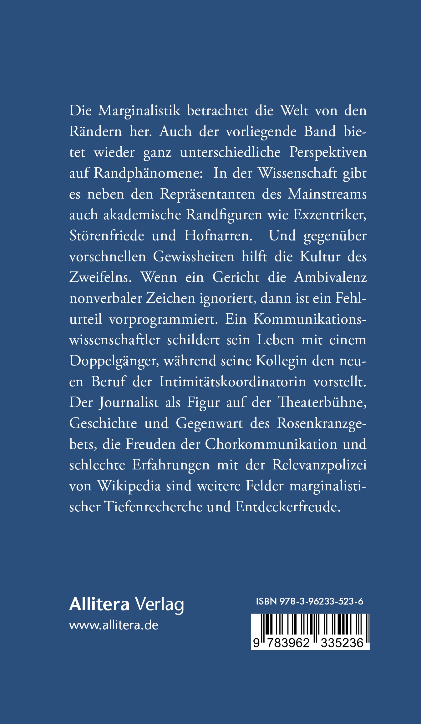 Die Marginalistik betrachtet die Welt von den Rändern her. Auch der vorliegende Band bietet wieder ganz unterschiedliche Perspektiven auf Randphänomene: In der Wissenschaft gibt es neben den Repräsentanten des Mainstreams auch akademische Randfiguren wie Exzentriker, Störenfriede und Hofnarren. Und gegenüber vorschnellen Gewissheiten hilft die Kultur des Zweifelns. Wenn ein Gericht die Ambivalenz nonverbaler Zeichen ignoriert, dann ist ein Fehlurteil vorprogrammiert. Ein Kommunikationswissenschaftler schildert sein Leben mit einem Doppelgänger, während seine Kollegin den neuen Beruf der Intimitätskoordinatorin vorstellt. Der Journalist als Figur auf der Theaterbühne, Geschichte und Gegenwart des Rosenkranzgebets, die Freuden der Chorkommunikation und schlechte Erfahrungen mit der Relevanzpolizei von Wikipedia sind weitere Felder marginalistischer Tiefenrecherche und Entdeckerfreude.
