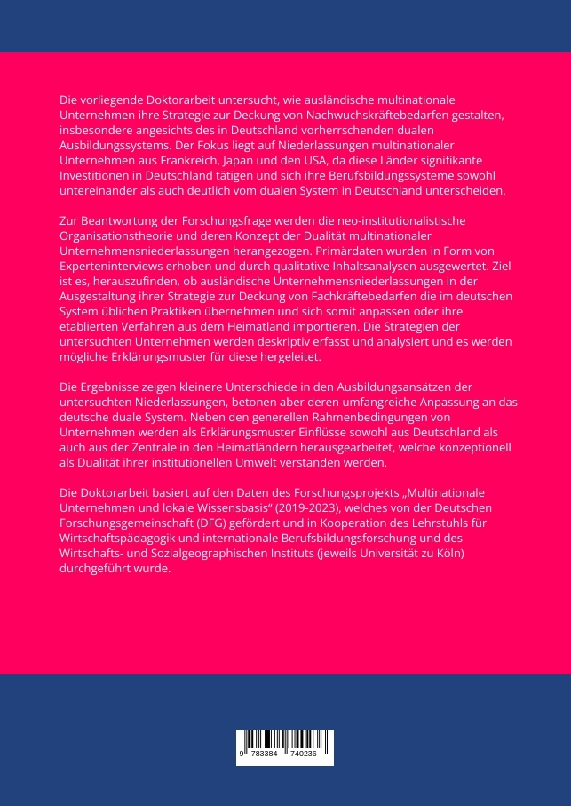 Die vorliegende Doktorarbeit untersucht, wie ausländische multinationale Unternehmen ihre Strategie zur Deckung von Nachwuchskräftebedarfen gestalten, insbesondere angesichts des in Deutschland vorherrschenden dualen Ausbildungssystems. Der Fokus liegt auf Niederlassungen multinationaler Unternehmen aus Frankreich, Japan und den USA, da diese Länder signifikante Investitionen in Deutschland tätigen und sich ihre Berufsbildungssysteme sowohl untereinander als auch deutlich vom dualen System in Deutschland unterscheiden. Zur Beantwortung der Forschungsfrage werden die neo-institutionalistische Organisationstheorie und deren Konzept der Dualität multinationaler Unternehmensniederlassungen herangezogen. Primärdaten wurden in Form von Experteninterviews erhoben und durch qualitative Inhaltsanalysen ausgewertet. Ziel ist es, herauszufinden, ob ausländische Unternehmensniederlassungen in der Ausgestaltung ihrer Strategie zur Deckung von Fachkräftebedarfen die im deutschen System üblichen Praktiken übernehmen und sich somit anpassen oder ihre etablierten Verfahren aus dem Heimatland importieren. Die Strategien der untersuchten Unternehmen werden deskriptiv erfasst und analysiert und es werden mögliche Erklärungsmuster für diese hergeleitet.Die Ergebnisse zeigen kleinere Unterschiede in den Ausbildungsansätzen der untersuchten Niederlassungen, betonen aber deren umfangreiche Anpassung an das deutsche duale System. Neben den generellen Rahmenbedingungen von Unternehmen werden als Erklärungsmuster Einflüsse sowohl aus Deutschland als auch aus der Zentrale in den Heimatländern herausgearbeitet, welche kon-zeptionell als Dualität ihrer institutionellen Umwelt verstanden werden.Die Doktorarbeit basiert auf den Daten des Forschungsprojekts "Multinationale Unternehmen und lokale Wissensbasis" (2019-2023), welches von der Deutschen Forschungsgemeinschaft (DFG) gefördert und in Kooperation des Lehrstuhls für Wirtschaftspädagogik und internationale Berufsbildungsforschung und des Wirtschafts- und Sozialgeographischen Instituts (jeweils Universität zu Köln) durchgeführt wurde.